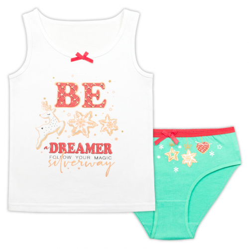 Состав: верх: 100%хлопок, низ: 100%хлопокОписание: Комплект для девочек майка и трусики. Майка для девочек на широких лямках. Центральный принт с золотым и цветным глиттером. Горловина декорирована атласным бантиком. Трусики слипы. По талии эластик с фестонным краем, декор в виде атласного бантика. Принт с золотым и цветным глиттером. Обработка эластиком по ноге.