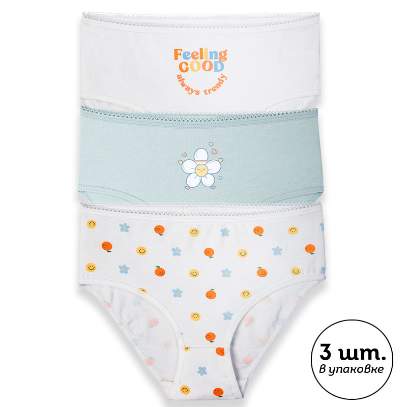 Состав: низ: 93%хлопок 7%эластан, низ2: 93%хлопок 7%эластан, низ:3 93%хлопок 7%эластанОписание: При выборе белья для своего ребёнка каждая мама хочет быть уверена в его качестве и в том, что ребёнку будет комфортно. Комплект трусов для девочки (3 шт.) полностью соответствует этим требованиям. Слипы высокой посадки выполнены из ткани с высоким содержанием хлопка — модель мягкая, прекрасно пропускает воздух, давая коже ребёнка дышать. Благодаря эластану в составе изделие надолго сохраняет отличную форму, даже после многочисленных стирок. Качественная ткань и анатомически правильный крой обеспечивают идеальную посадку на теле — ребёнку комфортно на протяжении всего дня. Мягкая резинка исключает раздражение и трение. Трусы детские для девочки представлены в трёх актуальных вариантах расцветки: белые со сплошным принтом в виде цветочков, смайликов и улыбающихся мандаринов, зелёные с принтом в виде улыбающейся ромашки и белые с позитивным принтом-надписью, надпись переводится: "хорошее настроение всегда в тренде". Принты эластичные и стойкие, отлично переносят частые стирки. В линейке представлены хлопковые трусы следующих размеров: 1 (86): 2 (92): 3 (98): 4 (104): 5 (110): 6 (116): 7 (122): 8 (128): 9 (134): 10 (140): 11 (146). Модель подходит девочкам дошкольного возраста, девочкам младшего школьного возраста и девочкам-подросткам. Трусы слипы для девочки — идеальный выбор детского белья для повседневной носки. Модные трусы станут хорошим подарком дочери или внучке на любой праздник. Выбирайте нужный размер по таблице размеров на фото. Цвет товара на экране вашего устройства может отличаться от цвета изделия вживую. Товар возврату и обмену не подлежит.