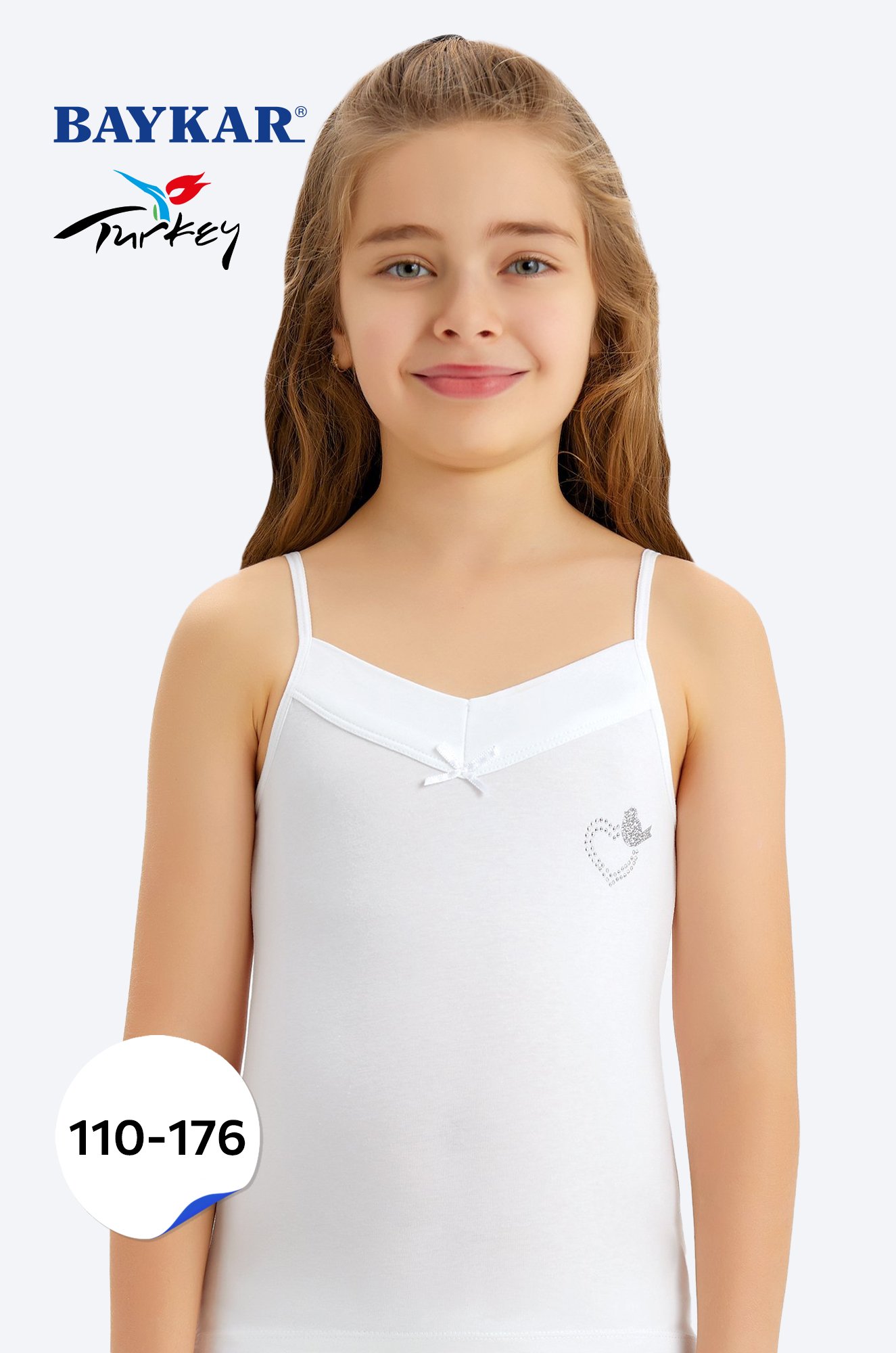 Нежность и забота в каждой нити! Детская бельевая майка для девочек и девочек-подростков выполнена из мягкого дышащего хлопка. Приталенный крой повторяет каждое движение тела и делает базовую майку для детей удобной для активных школьных будней. Белая майка на тонких бретельках украшена милым рисунком из страз и атласным бантиком.