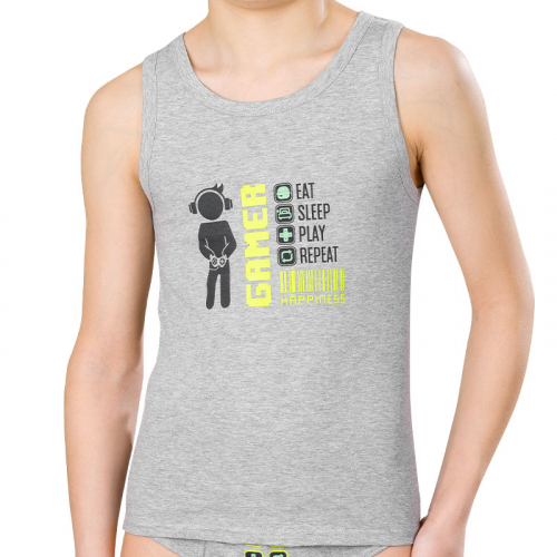 Состав: 100%хлопокОписание: Если вы в поисках качественного, комфортного и стильного белья для своего ребёнка, обратите внимание на нашу майку из 100% хлопка для мальчика. Натуральный состав ткани обеспечивает изделию мягкость и воздухопроницаемость — кожа ребёнка дышит. Модель комфортно сидит по фигуре, её можно надевать под рубашку, джемпер, свитер. Горловина и проймы изделия обработаны в тон изделия — они хорошо держат форму, мягкие, надолго сохраняют аккуратный внешний вид. Майка представлена в актуальном оттенке "серый меланж". Практичный и универсальный, он великолепно сочетается с любой одеждой. Модель украшает забавный принт геймерской тематики — понравится любому мальчишке! Перевод: "есть, спать, играть, повторять. Счастье". Принт эластичный и прочный — отлично переносит частые стирки. Такая майка идеальна для повседневной носки, а также для отдыха. Станет замечательным подарком, который способен вызвать искреннюю радость у каждого ребёнка, оставив незабываемые воспоминания о любом празднике и принося массу удовольствия каждый