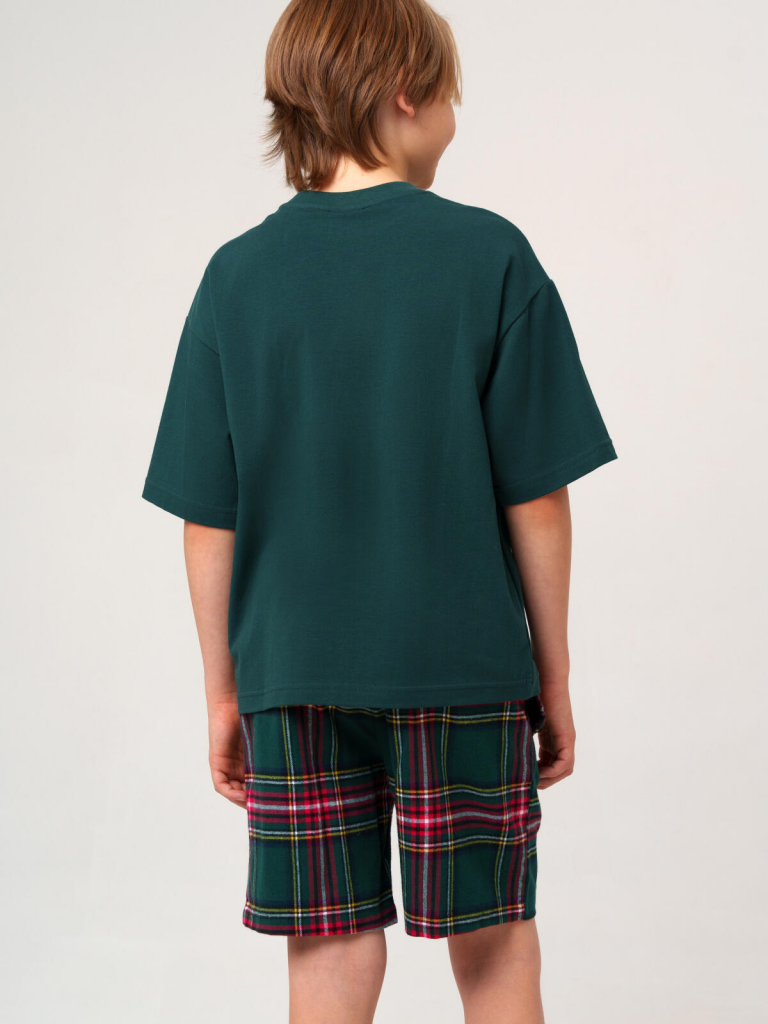 Стильная подростковая пижама для мальчика от PlayToday — удобный комплект для сна и отдыха, состоящий из мягкой хлопковой футболки и текстильных шорт в клетку. Практичный дизайн с современным принтом делает пижаму не только комфортной, но и модной частью подросткового гардероба.Преимущества модели:+ футболка из хлопкового трикотажа — дышащая, мягкая и гипоаллергенная+ шорты с микроначёсом — приятные к телу и сохраняют тепло+ удобный пояс на резинке со шнурком — комфортная посадка и регулировка объёма+ 2 кармана — практичное решение для домасвободный крой — обеспечивает свободу движений во сне и на отдыхеКогда и как носить:Пижама подходит для ночного сна, домашних игр, отдыха на даче и гостевых ночёвок. Лёгкий верх и шорты делают её отличным выбором для тёплого времени года.Совет по стилю:Сочетайте пижаму с мягкими тапочками и домашним халатом PlayToday, чтобы создать уютный образ для мальчика.Размеры: 128-152 см — для мальчиков от 8 лет и старше, подойдёт как для младших школьников, так и для подростков.Стильная пижама для мальчиков-подростков от PlayToday — комфорт и современный дизайн для сна и отдыха. Футболка: 95% хлопок, 5% эластан, Шорты: 100% хлопок