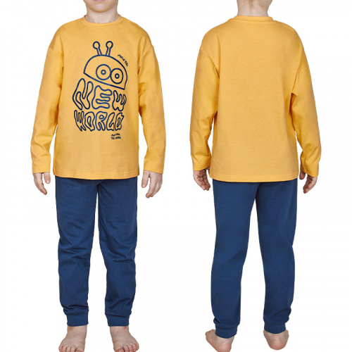 Состав: верх: 100%хлопок, низ: 100%хлопокОписание: Пижама детская для мальчика. Натуральный состав ткани (100% хлопка) обеспечивает изделию мягкость, гипоаллергенность и воздухопроницаемость. Благодаря этому сон комфортный и качественный. В пижаме из хлопка ребёнку будет тепло, даже если он сбросит одеяло. Джемпер и брюки умеренного объёма, рукава широкие и свободные — комплект для сна очень удобен. В поясе и по низу брюк мягкая и широкая резинка — не перекручивается и не давит. Отделка горловины джемпера из эластичной рибаны — ребёнку удобно надевать и снимать пижаму. А также рибана сохраняет отличную форму надолго. Хлопковая пижама украшена забавным принтом, надписи переводятся: «найди меня», «новый мир», «будущее за тобой». Фишка модели — принт светится в темноте! Такая особенность непременно понравится любому ребёнку. Детская пижама для мальчика неприхотлива в уходе. Принт эластичный и мягкий, легко переносит частые стирки. Детская пижама с брюками подходит для сна как дома, так и в детском саду — отличный выбор для вашего ребёнка! Помните о правильном уходе за изделием: рекомендуется стирать при температуре не выше 30 °C, без предварительного замачивания, с изнанки. Это поможет сохранить качество и цвет пижамы на длительное время. Не забывайте о выборе правильного размера. Используйте таблицу размеров на фотографии, чтобы выбрать подходящий вариант для вашего мальчика. Обратите внимание, что цвет товара на экране вашего устройства может отличаться от реального.