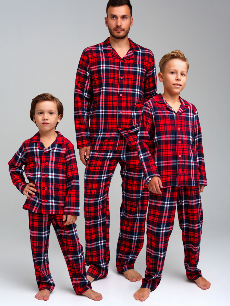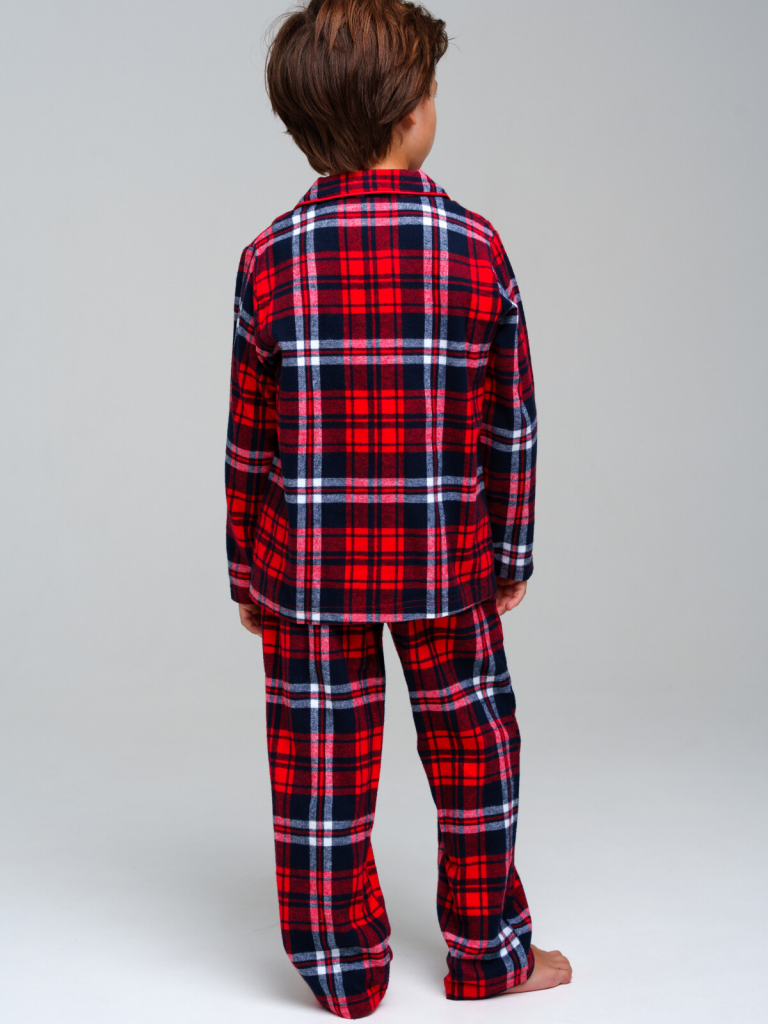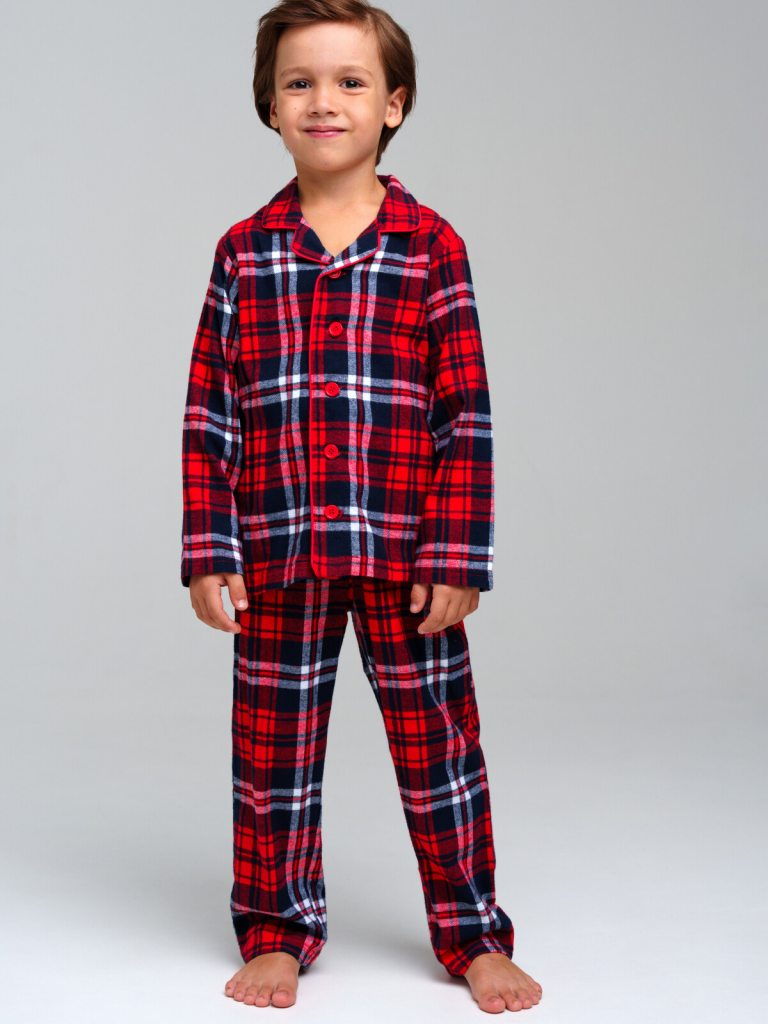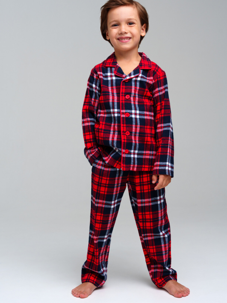 Пижама детская для мальчика. 100% хлопок. Фланель - мягкая, приятная к телу ткань с небольшим начесом. Застежка на пуговицы. Карманы в брюках. Эластичный пояс с тесьмой позволяет легко надевать брюки и утягивать до комфортной посадки.