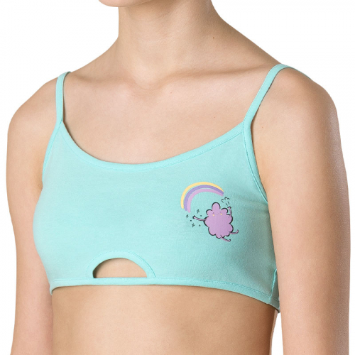 Состав: 93%хлопок 7%эластанОписание: Если вы хотите купить своему ребёнку действительно качественное, красивое и комфортное нижнее бельё, представляем вам топ для девочки. Бра выполнено из ткани с высоким содержанием хлопка. Изделие мягкое, воздухопроницаемое — кожа ребёнка отлично дышит. Эластан в составе ткани обеспечивает модели прекрасную форму на протяжении долгого времени. Благодаря качественному материалу и правильному крою топ идеально садится по телу и дарит ребёнку комфорт на протяжении всего дня. Тонкие мягкие бретели не сползают, исключают трение и раздражение. По низу и проймам окантовка в тон изделия, благодаря чему они не растягиваются. Топ актуального голубого оттенка украшен нежным позитивным принтом, а также небольшим декоративным отверстием спереди по низу. Бра отлично подходит для носки под одеждой — идеальный выбор белья для девочки-подростка. Станет замечательным подарком, который способен вызвать искреннюю радость у каждого ребёнка, оставив незабываемые воспоминания о любом празднике и принося массу удовольствия каждый ден