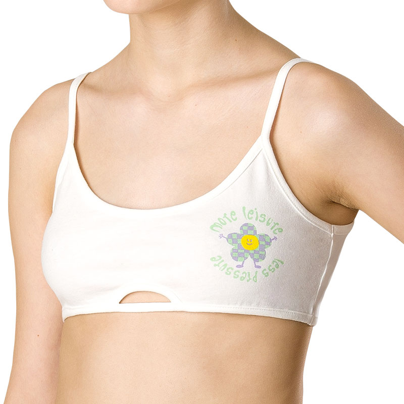 Состав: 93%хлопок 7%эластанОписание: При выборе белья для своего ребёнка, каждая мама хочет быть уверена в его качестве и в том, что ребёнку будет комфортно. Наш укороченный топ для девочки полностью соответствует этим требованиям. В составе ткани преобладает хлопок — бра приятно на ощупь, великолепно пропускает воздух, кожа ребёнка дышит. Эластан обеспечивает изделию прекрасную форму надолго. Ткань отличного качества и грамотный крой — залог идеальной посадки белья. Ребёнок чувствует себя комфортно на протяжении всего дня. Тонкие мягкие бретели не сползают и не давят. Низ и проймы окантованы пайпингом в тон топа, благодаря этому они не растягиваются. Бра классического белого цвета универсально — его можно носить под любой одеждой, в том числе под белой блузкой. Модель украшена милым принтом с позитивным посылом, а также небольшим декоративным отверстием спереди по низу. Принт эластичный и стойкий, отлично переносит частые стирки. Перевод принта: "Больше досуга, меньше давления". Идеальный вариант белья для девочки-подростка! Станет замечательны