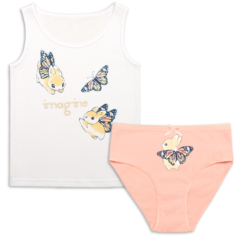 Состав: верх: 100%хлопок, низ: 100%хлопокОписание: Комплект для девочек майка и трусики. Майка на широких лямках, отделка горловины и пройм пайпингом. Прочный принт, надпись с золотом. Перевод Воображай. Трусики слипы. По талии эластик с фестонным краем, декорирован атласным бантиком, обработка эластиком по ноге. Прочный принт.