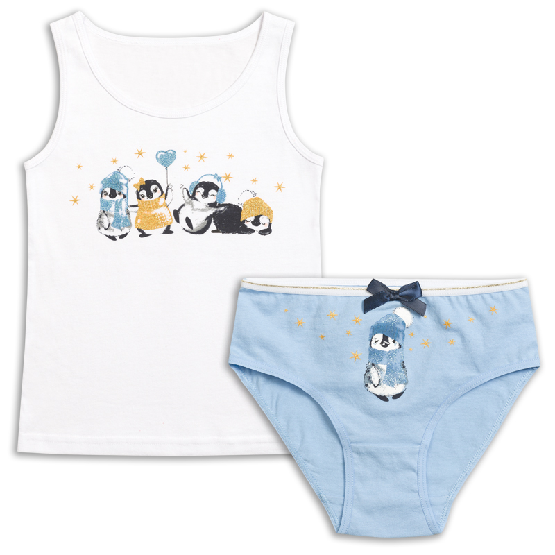 Состав: верх: 100%хлопок, низ: 100%хлопокОписание: Комплект для девочек майка на широких лямках и трусики слипы с декором в виде атласного бантика и эластиком по талии с золотым люрексом. Мягкий эластичный принт с разноцветным глиттером.