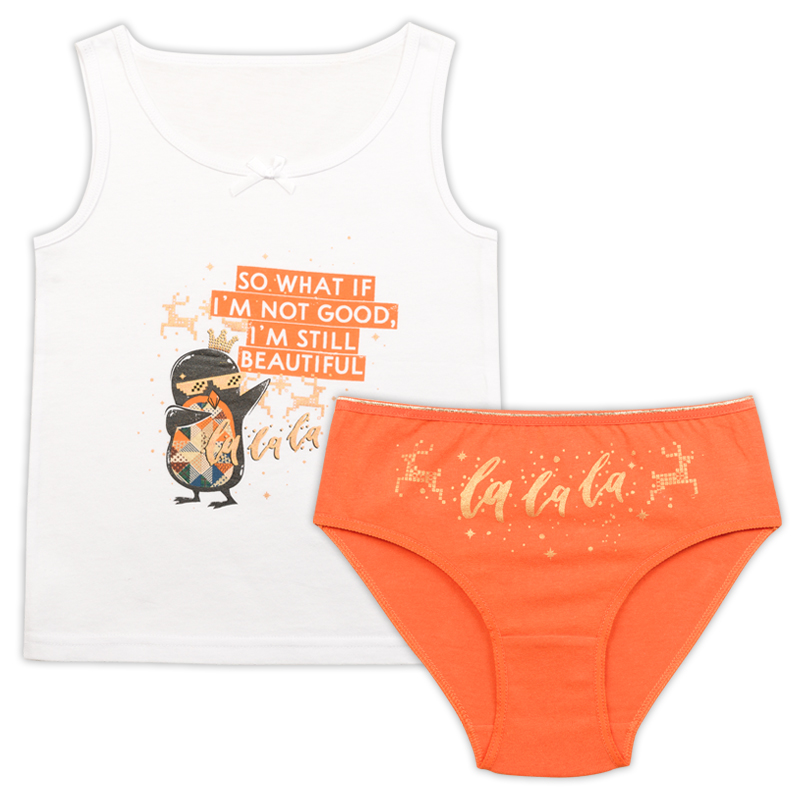 Состав: верх: 100%хлопок, низ: 100%хлопокОписание: Комплект для девочек майка и трусики. Майка для девочек на широких лямках. Центральный принт с золотом и глиттером. Трусики слипы. По талии эластик с люрексом. Принт с золотом. Обработка эластиком по ноге.