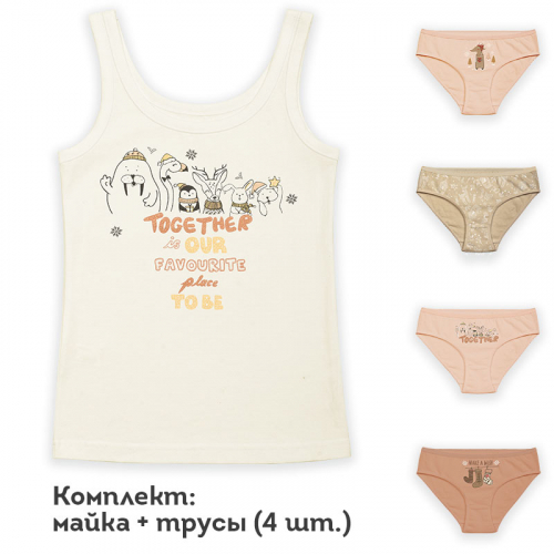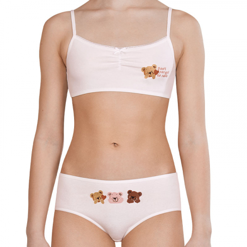Состав: верх: 93%хлопок 7%эластан, низ: 93%хлопок 7%эластанОписание: Комплект белья для девочки, топ и трусы. Укороченный топ и слипы средней посадки выполнены из ткани с высоким содержанием хлопка, что делает их мягкими, гипоаллергенными и дышащими. Эластан обеспечивает комплекту прекрасную форму на протяжении длительного времени. Топ мягкий, тонкие бретели не сползают, исключают трение и раздражение. По проймам, низу и верхнему краю спинки окантовка из пайпинга в тон изделия, благодаря чему они не растягиваются. Спереди по центру топа небольшая сборка для дополнительного объема. Бра украшено милым принтом в виде медвежонка, надпись переводится: «не теряй свою улыбку», принт устойчивый и не боится частых стирок. Кроп топ детский отлично подходит для носки под одеждой. Трусики для девочки также декорированы принтом в виде трёх милых медвежат. Принты эластичные и стойкие, легко переносят частые стирки. Хлопковые трусы подходят девочкам дошкольного возраста. Помните о правильном уходе за изделием: рекомендуется стирать при температуре не выше 30 °C, без предварительного замачивания, с изнанки. Это поможет сохранить качество и цвет белья на длительное время. Не забывайте о выборе правильного размера. Используйте таблицу размеров на фотографии, чтобы выбрать подходящий вариант для вашей девочки. Обратите внимание, что цвет товара на экране вашего устройства может отличаться от реального.