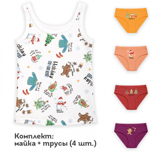 Состав: верх: 93%хлопок 7%эластан, низ: 93%хлопок 7%эластан, низ2: 93%хлопок 7%эластан, низ:3 93%хлопок 7%эластан, низ:4 93%хлопок 7%эластанОписание: Детский комплект белья для девочки малыша из хлопка с новогодним принтом. В набор входит бельевая майка на широких лямках и трусы слипы 4 штуки. Подарите ребенку праздничное настроение и хорошее начало дня. Новогодняя коллекция, яркий цветной набор с принтом с надписями, идеально подойдет для подарка ребенку. Пошив высокого качества, аккуратные швы, которые не доставят дискомфорт для ребенка. Трусики и майка идеально впишутся в гардероб девочки как базовое детское нижнее белье. Удобная и практичная модель майки для детей подходит для повседневной носки дома, как одежда для сна, для занятия спортом, для занятия спортом, а еще в нем весело готовиться и встречать новый год. Трикотажные детские трусики слипы для подростка с эластичной резинкой по талии надежно держатся на теле, не скручиваются, не закатываются и не сползают, а дышащая ткань позволяет избежать натирания нежной кожи.