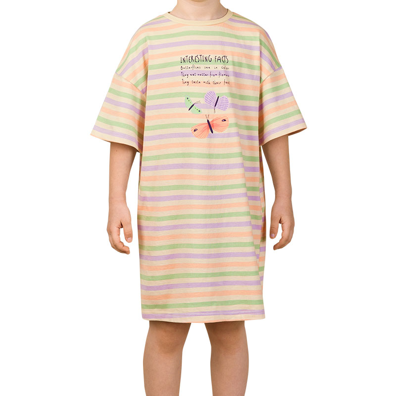 Состав: 100%хлопокОписание: Стильная и уютная ночная сорочка для девочки в нежных пастельных оттенках. В составе ткани 100% хлопка — идеально для детской одежды! Модель приятна на ощупь, прекрасно пропускает воздух, позволяя коже ребёнка дышать. При этом в ночной рубашке из хлопка ребёнку будет уютно, даже если он сбросит одеяло. Всё это обеспечивает комфортный и качественный сон. Сорочка для девочки свободная, плечо немного спущено, рукава широкие — в ней очень удобно спать. Отделка горловины из эластичной рибаны — она не растягивается, ребёнку удобно надевать и снимать рубашку. Домашнее платье в полоску украшает милый принт в виде бабочек. Надписи переводятся: "интересные факты", "бабочки видят в цвете", "они питаются нектаром с цветов", "вкусовые рецепторы у них находятся на лапках". В линейке представлены следующие размеры: 2 (92): 3 (98): 4 (104): 5 (110): 6 (116), 7 (122): 8 (128): 9 (134): 10 (140): 11 (146). Сорочка рубашка идеальна для сна и отдыха дома — прекрасный выбор для вашего ребёнка! Ночная сорочка с принтом подходит для круглогодичного использования. Сорочка детская для девочки — замечательный подарок дочке, внучке, сестре на любой праздник. Выбирайте нужный размер по таблице размеров на фото. Цвет товара на экране вашего устройства может отличаться от цвета изделия вживую. Товар возврату и обмену не подлежит.