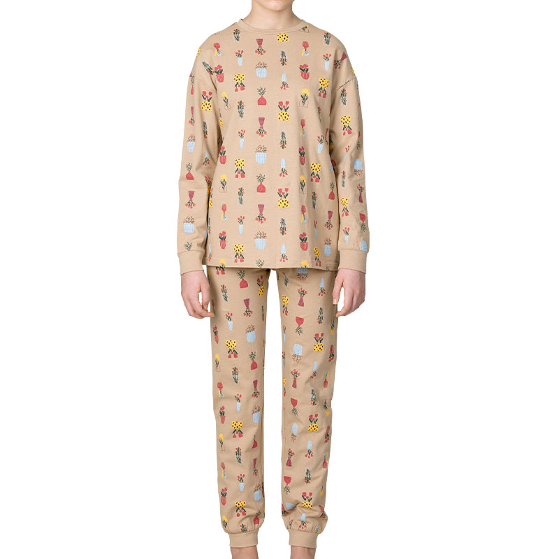 Состав: верх: 100%хлопок, низ: 100%хлопокОписание: Плюс 100 к уюту с нашей милой пижамой для девочки! Модель в стиле "хюгге" выполнена из 100% хлопка — оптимальный состав для детской пижамы. Ткань изделия тёплая, приятная на ощупь, превосходно пропускает воздух — кожа ребёнка дышит. Благодаря этому сон комфортный и качественный. Джемпер и брюки среднего объёма, плечо слегка спущено, рукава широкие и свободные — пижама очень удобна для сна. Широкая и мягкая резинка в поясе не перекручивается и не давит. Манжеты и отделка горловины эластичные — комплект удобно надевать и снимать. Пижама представлена в красивом бежевом цвете "овсяное молоко" — очень уютном и нежном. Комплект украшает оригинальный цветочный принт. Он непременно понравится любой девочке. Такая пижама идеальна для сна как дома, так и в детском саду — отличный подарок вашей дочке, сестрёнке или племяннице!
