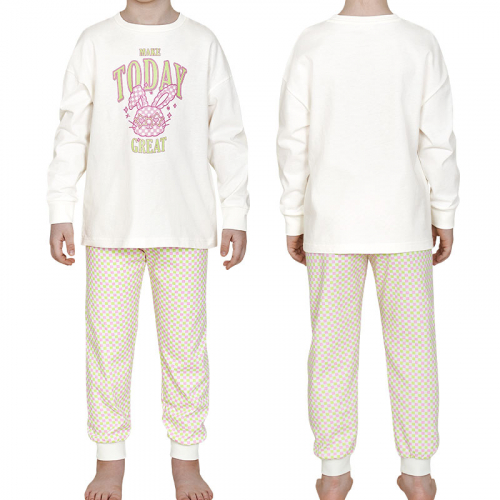 Состав: верх: 100%хлопок, низ: 100%хлопокОписание: Детская пижама для девочки. Модель выполнена из 100% хлопка — идеальный вариант для детской пижамы. Комплект для сна мягкий, гипоаллергенный и хорошо пропускает воздух. В хлопковой пижаме ребёнку будет тепло, даже если он раскроется во время сна. Всё это способствует комфортному и качественному сну. Джемпер и брюки умеренного объёма, плечо немного спущено, рукава широкие и свободные — в пижаме очень удобно спать. В поясе брюк мягкая и широкая резинка — не перекручивается и не давит. Манжеты и отделка горловины из эластичной рибаны — они не растягиваются, пижаму удобно надевать и снимать. Хлопковая пижама украшена милым принтом в виде зайчика в очках, надпись переводится: «сделай сегодняшний день отличным» — понравится любой девочке. Брюки декорированы сплошным принтом в мелкую клетку. Детская пижама неприхотлива в уходе. Принт эластичный и мягкий, легко переносит частые стирки. Детская пижама с брюками подходит для сна как дома, так и в детском саду — отличный выбор для вашего ребёнка! Помните о правильном уходе за изделием: рекомендуется стирать при температуре не выше 30 °C, без предварительного замачивания, с изнанки. Это поможет сохранить качество и цвет пижамы на длительное время. Не забывайте о выборе правильного размера. Используйте таблицу размеров на фотографии, чтобы выбрать подходящий вариант для вашей девочки. Обратите внимание, что цвет товара на экране вашего устройства может отличаться от реального.