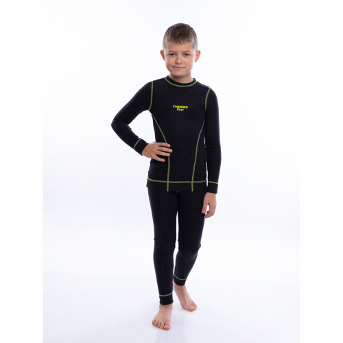 Детское термобельё, либо детский термокомплект - необходимый предмет одежды для активного отдыха и повседневных прогулок в холодное время года. Оно относится к нижнему белью, которое отлично сохраняет тепло, а при перегреве отводит влагу и пот с поверхности тела. Воздух, содержащийся в термобелье, за счёт пористой фактуры ткани, соприкасаясь с телом, нагревается до комфортной температуры. Наш комплект состоит из облегающих брюк на манжетах и футболки с длинными рукавами на манжетах и выполнен из хлопковой и пористой по своей фактуре ткани с небольшим начёсом - кашкорсе с эластаном. Горловина обрабатывается под планку, а основные внутренние швы обработаны специальным способом, что делает их неощутимыми. Такой термокомплект также прекрасно подходит и для домашнего времяпрепровождения и для ночного сна.