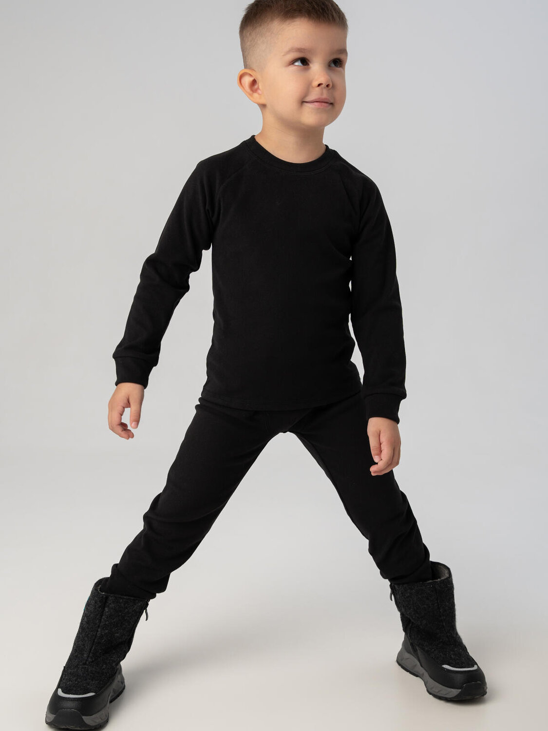 Детское однотонное черное термобельё для мальчика от PlayToday — идеальный первый слой для холодного сезона. Комплект из кофты и брюк с начёсом сохраняет тепло тела, эффективно отводит влагу и быстро сохнет. Мягкий эластичный материал не сковывает движений и обеспечивает комфортную посадку, а плоские швы не натирают даже при длительной носке. Благодаря удобному крою и нежной к телу ткани, термобельё отлично подходит как для прогулок на свежем воздухе, так и для активных занятий спортом.