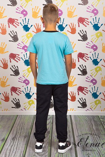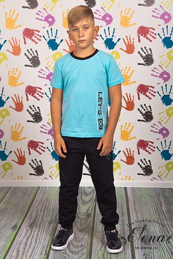 Футболка с принтом спереди выполнена из х/б полотна. Планка горловины выполнена из рибаны чёрного цвета, по плечевым швам и середине рукава настрочена репсовая лента .