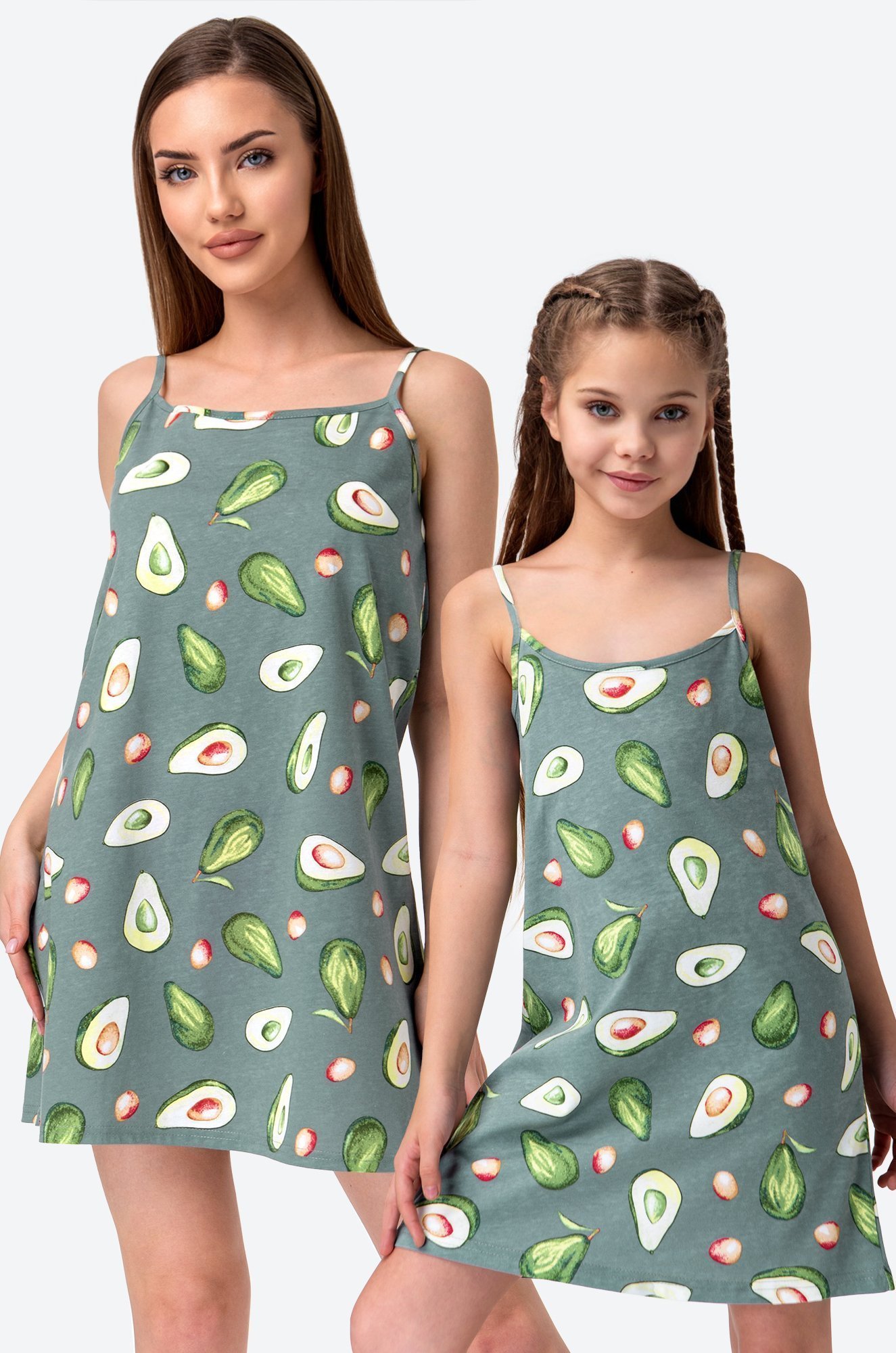 Детская сорочка для девочек и девочек-..показатьподростков выполнена из натурального 100% хлопка. Аккуратные тонкие бретели, удобный А-силуэт и длина выше колена – каждая деталь создана для комфорта ребенка. Сорочка для детей представлена в нежном зеленом цвете и украшена принтом авокадо.