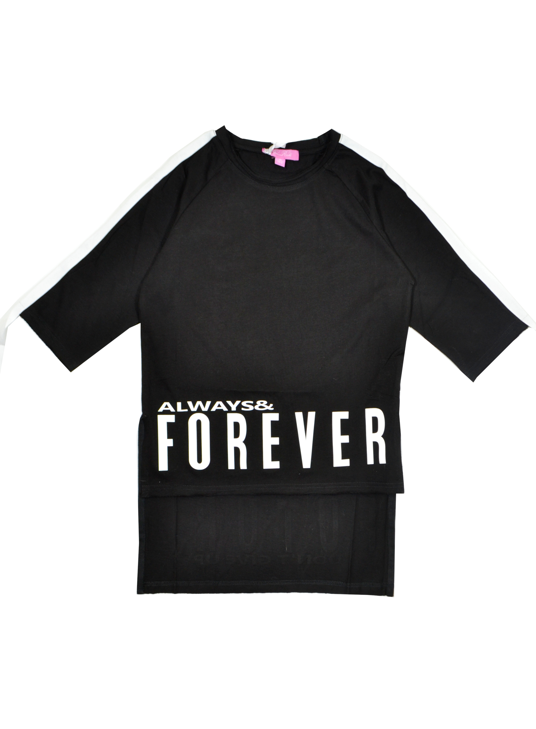 Стильная туника для девочки. Рукав 3/4 длины, длина немного ниже локтя. По рукавам дополнена тесьмой белого цвета. Спинка намного длиннее переда. Горловина не широкая, трикотаж в два слоя с необработанными краями. По низу принт. По спинке также принт по низу. В размер.