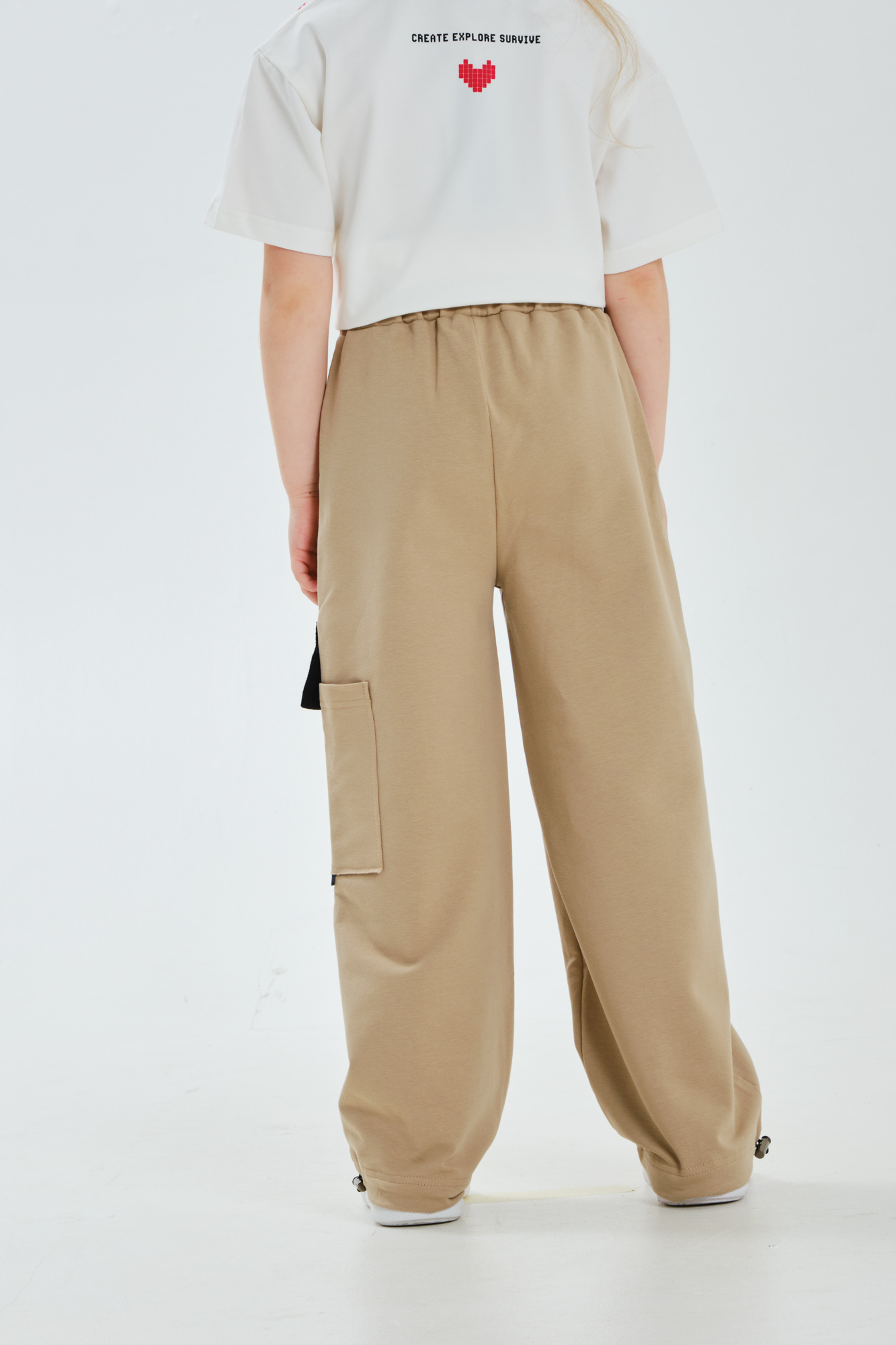 Пояс на мягкой эластичной резине, по низу брюк эластичная регулируемая затяжка.