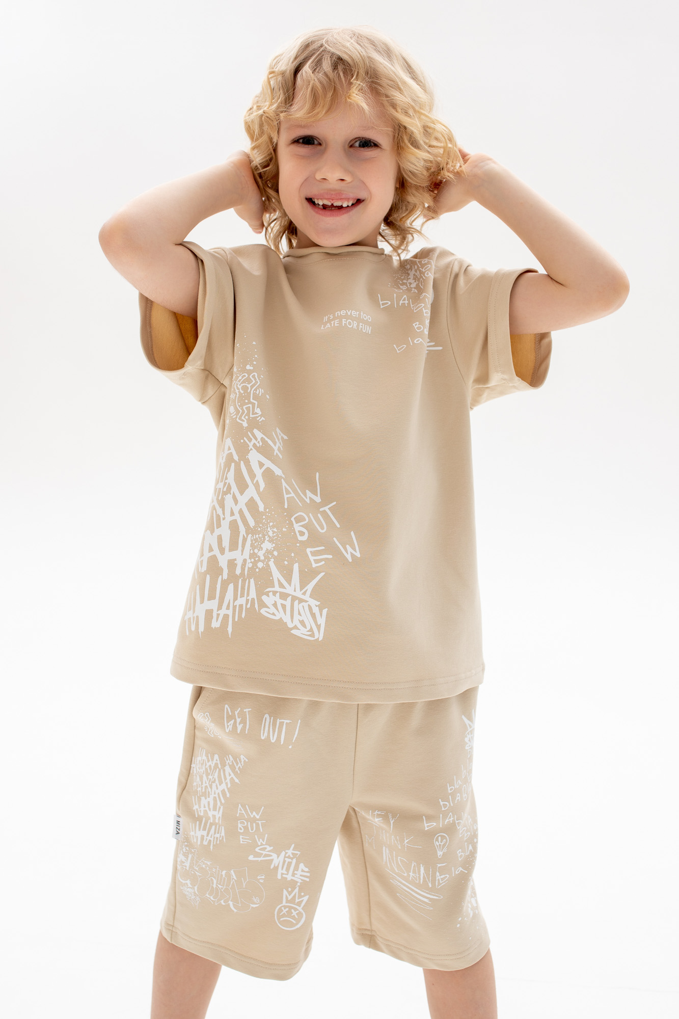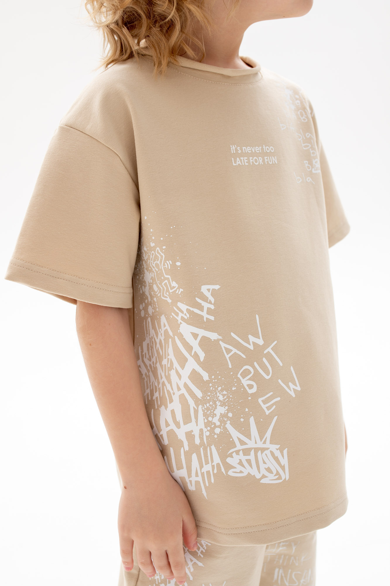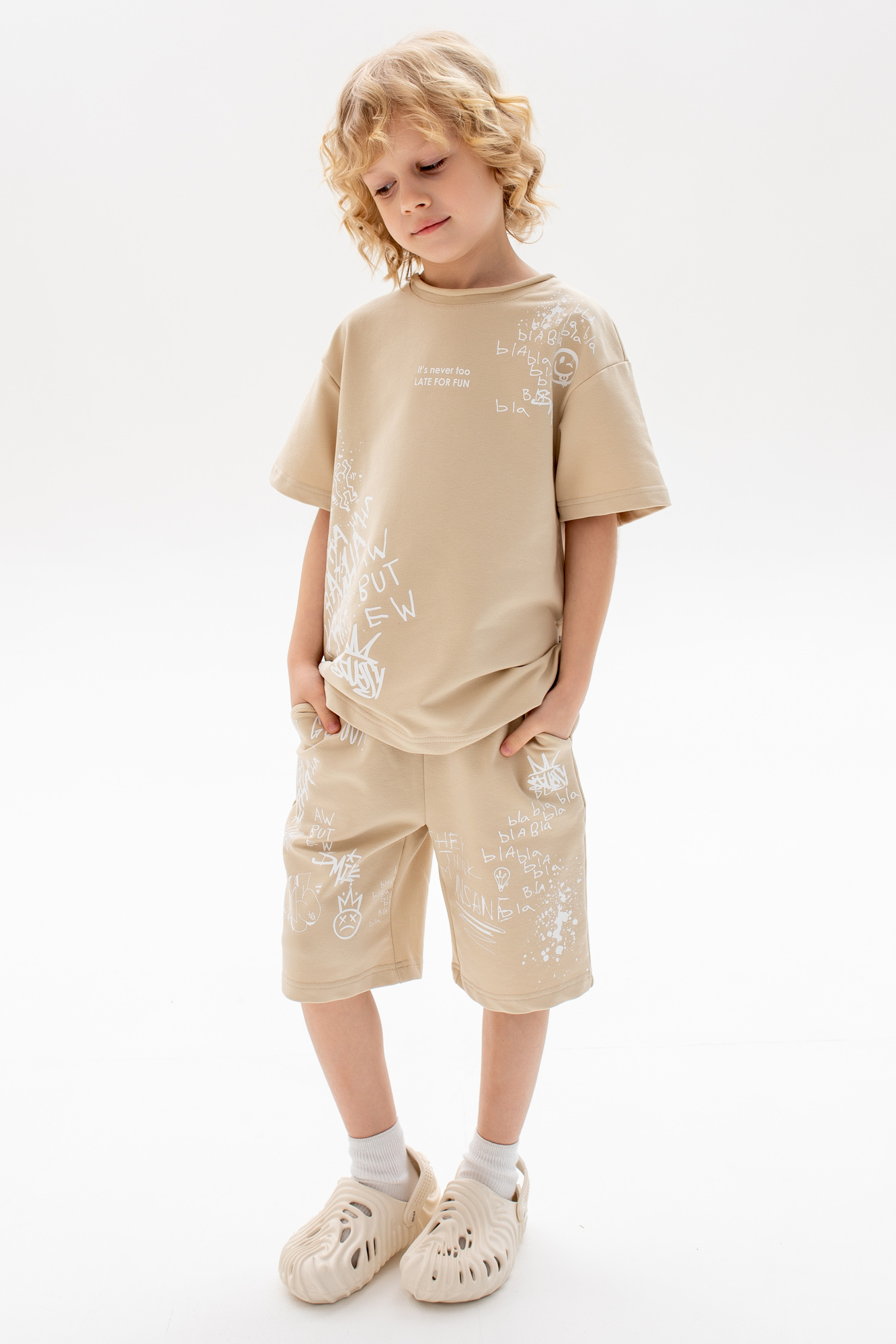 Состоит из футболки свободного кроя и прямых шорт с
