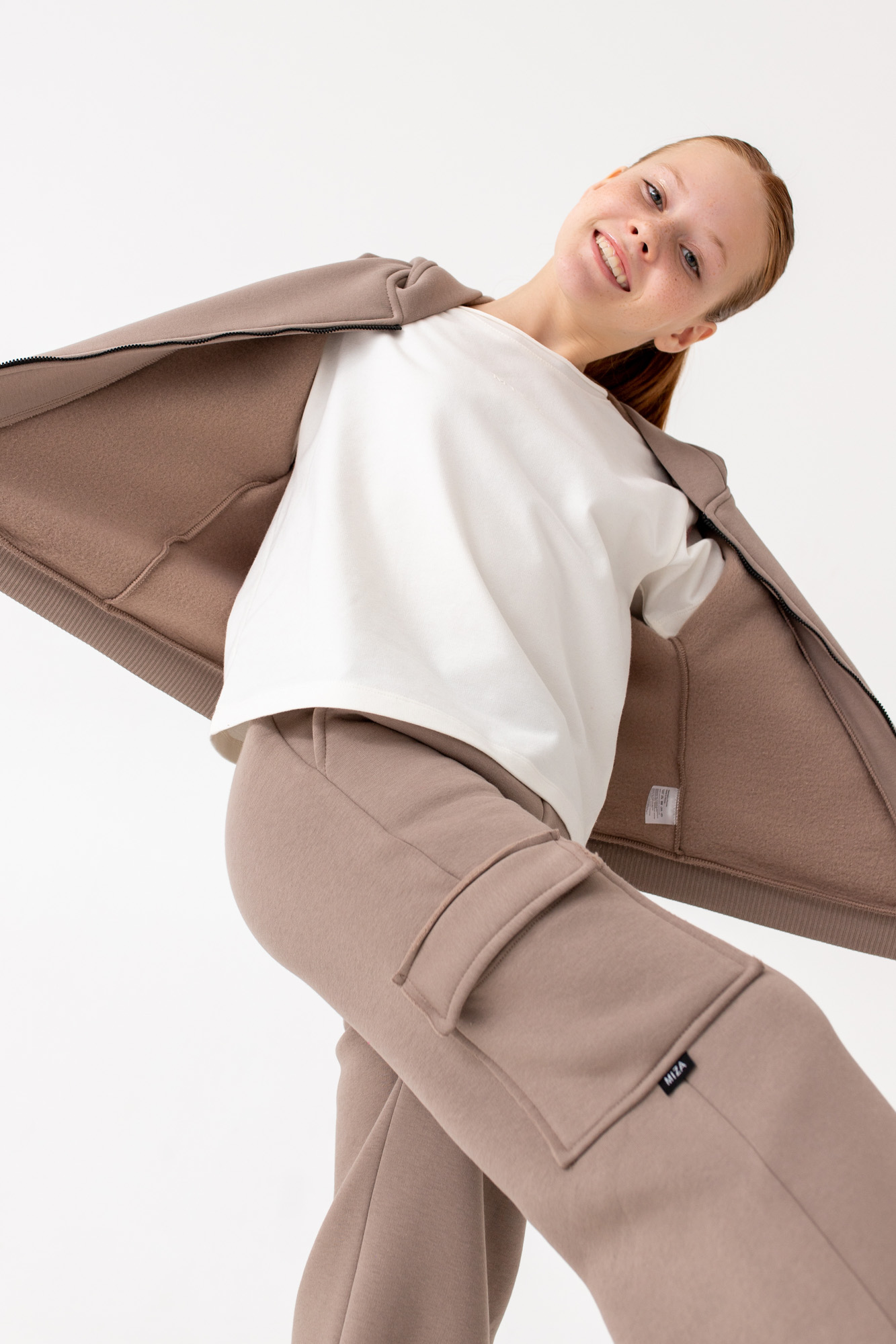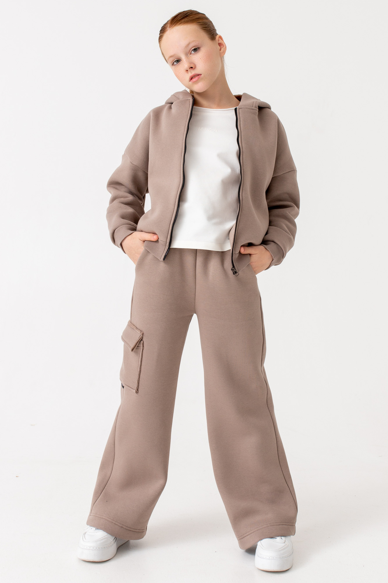 Состоит из укороченного худи на замке и широких брюк с накладным карманом на одной стороне.