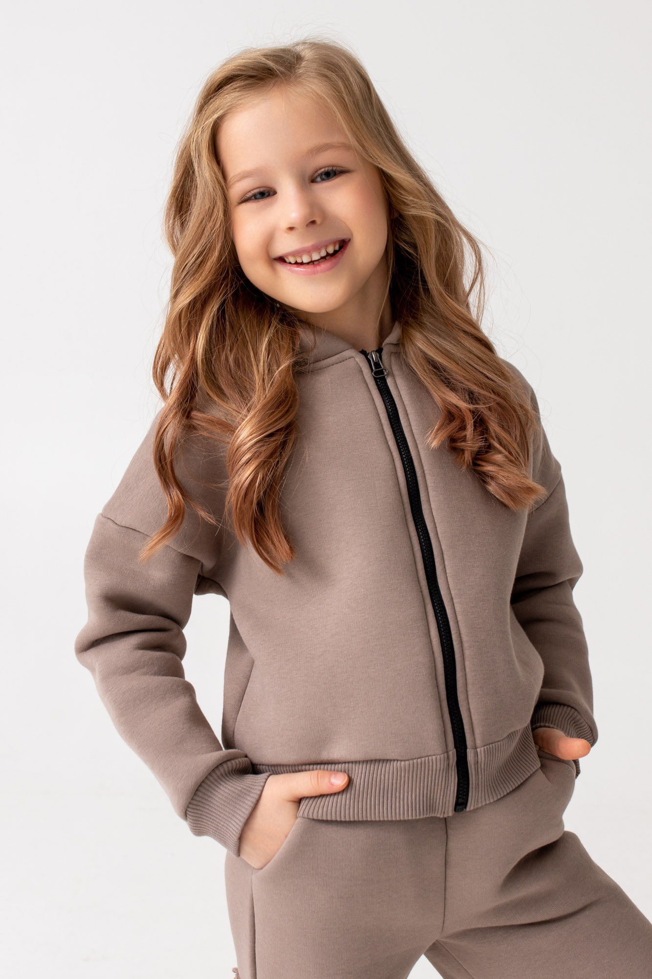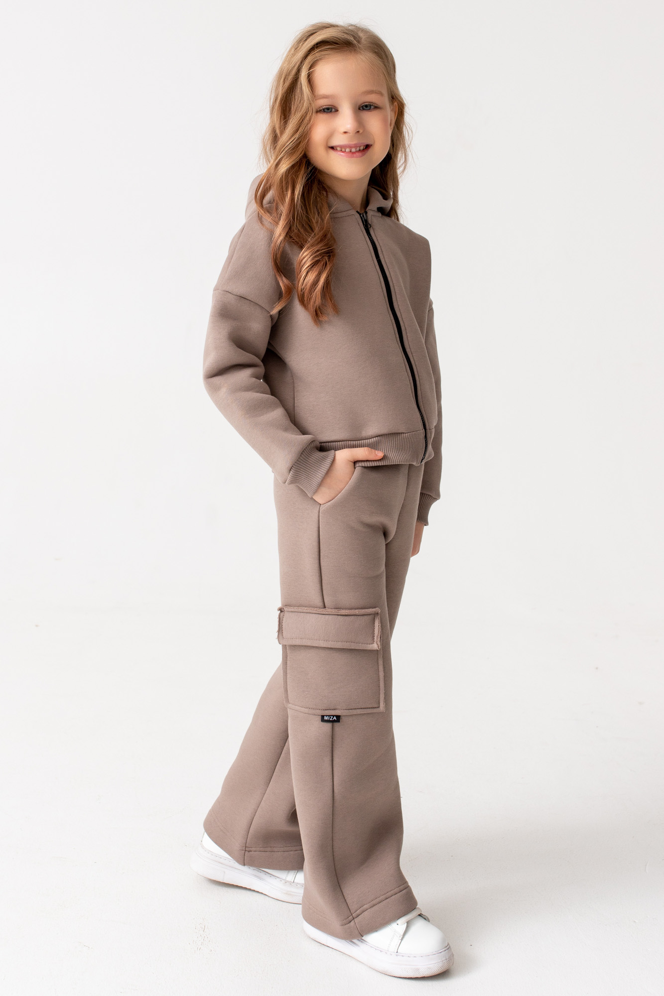 Состоит из укороченного худи на замке и широких брюк с накладным карманом на одной стороне.
