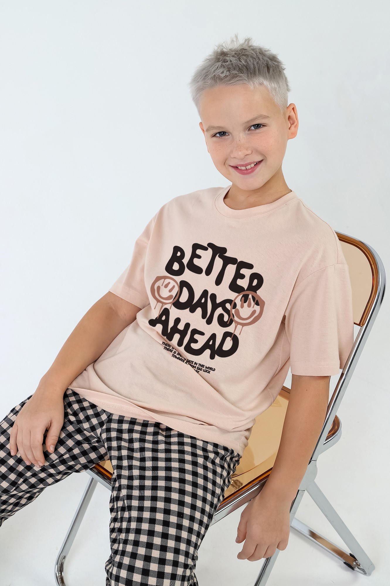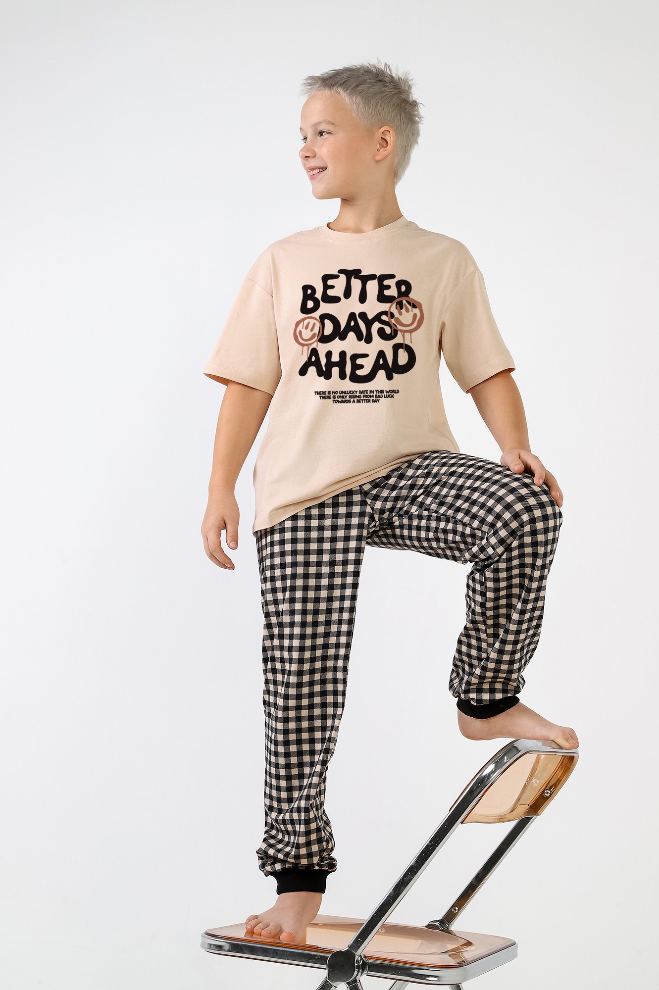 Пижама для мальчика, состоящая из футболки и брюк. Футболка - из гладкокрашеного трикотажного полотна "кулирка", классического покроя: с короткими втачными рукавами, горловиной овальной формы, обработанной втачной планкой и принтом в центре переда, выполненным в технике шелкографии. Брюки - из трикотажного полотна "кулирка" в клетку, длинные, с эластичной тесьмой на поясе и притачными манжетами из полотна "кашкорсе" черного цвета.