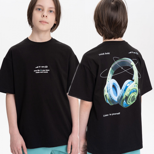 Состав: 100%хлопокОписание: Футболка для мальчика прямого кроя - это идеальный выбор для активного ребенка. Вырез горловины обработан эластичной тканью — она прекрасно держит форму, не растягивается, при этом ребёнку удобно надевать и снимать футболку. Изделие неприхотливо в уходе. Футболка летняя с принтом на спине и надписями в стиле Digital. Перевод надписей: "your life&your ideas" - твоя жизнь и твои идеи, "make new trends" - создавай новые тренды, "think bold, listen to yourself, make new trends" - будь смелее, слушай себя, создавай новые тренды". Яркая спортивная футболка подходит как для подростков так и для малышей в детский сад. Подходит для любого времени года.