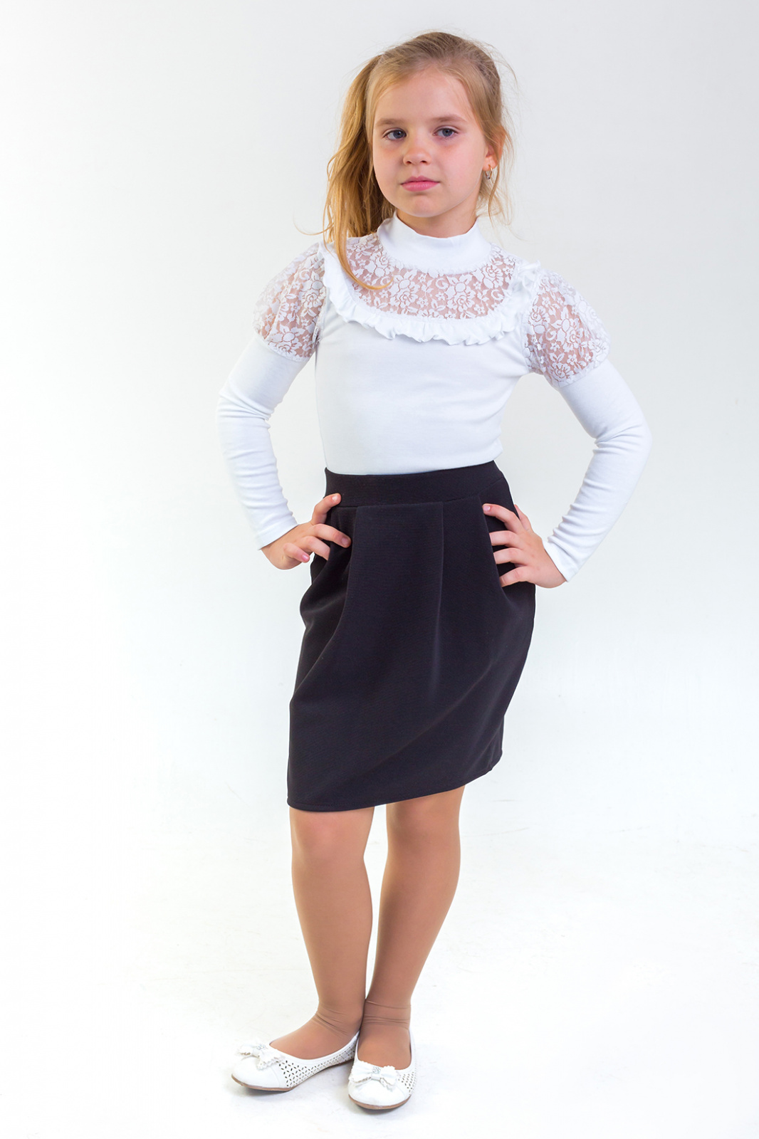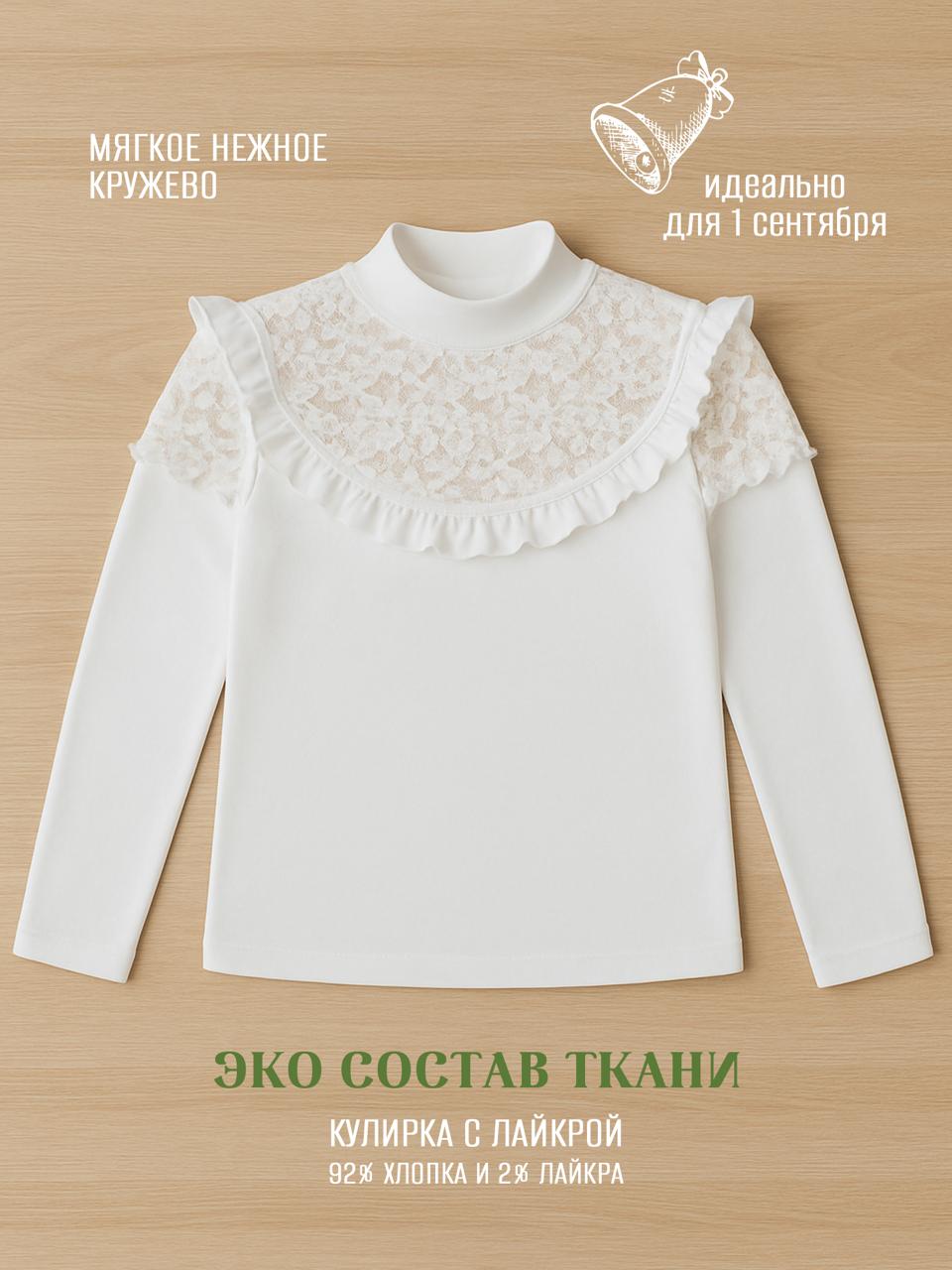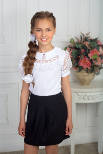 Блузка для школы выполнена из трикотажных полотен : интерлока и ажура.Привлекают внимание кокетка ,окаймленная рюшкой, и верх рукава " фонарик ".