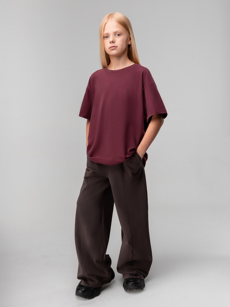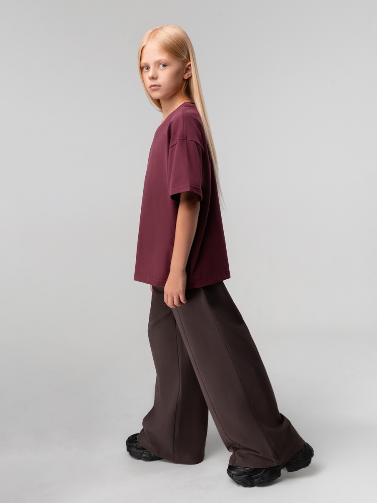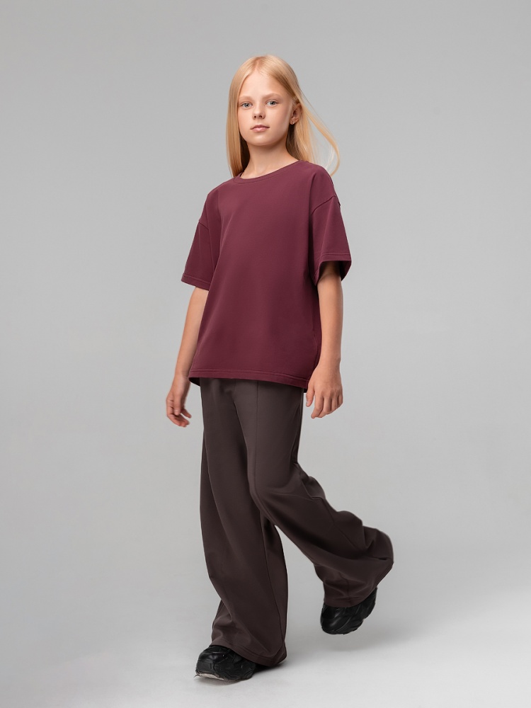 Материал футер двухнитка Состав 92% хлопок 8% лайкра Брюки для детей школьного возраста. Брюки свободные, расширенные к низу, на притачном поясе с внутренней резинкой, с боковыми карманами. Передние половинки брюк с вертикальными рельефами от талии до низа изделия. Низ изделия обработан на спец. машине.