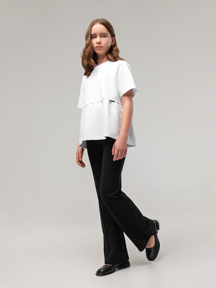 Материал футер двухнитка Состав 92% хлопок 8% лайкра Брюки-клеш с вертикальными рельефами от талии до низа.