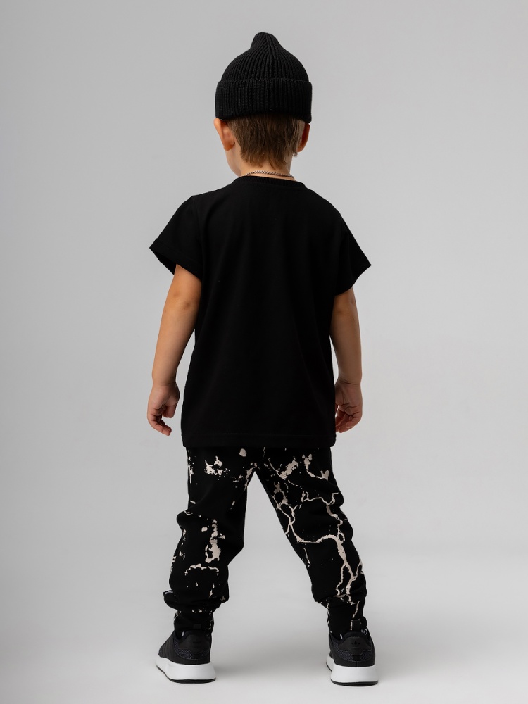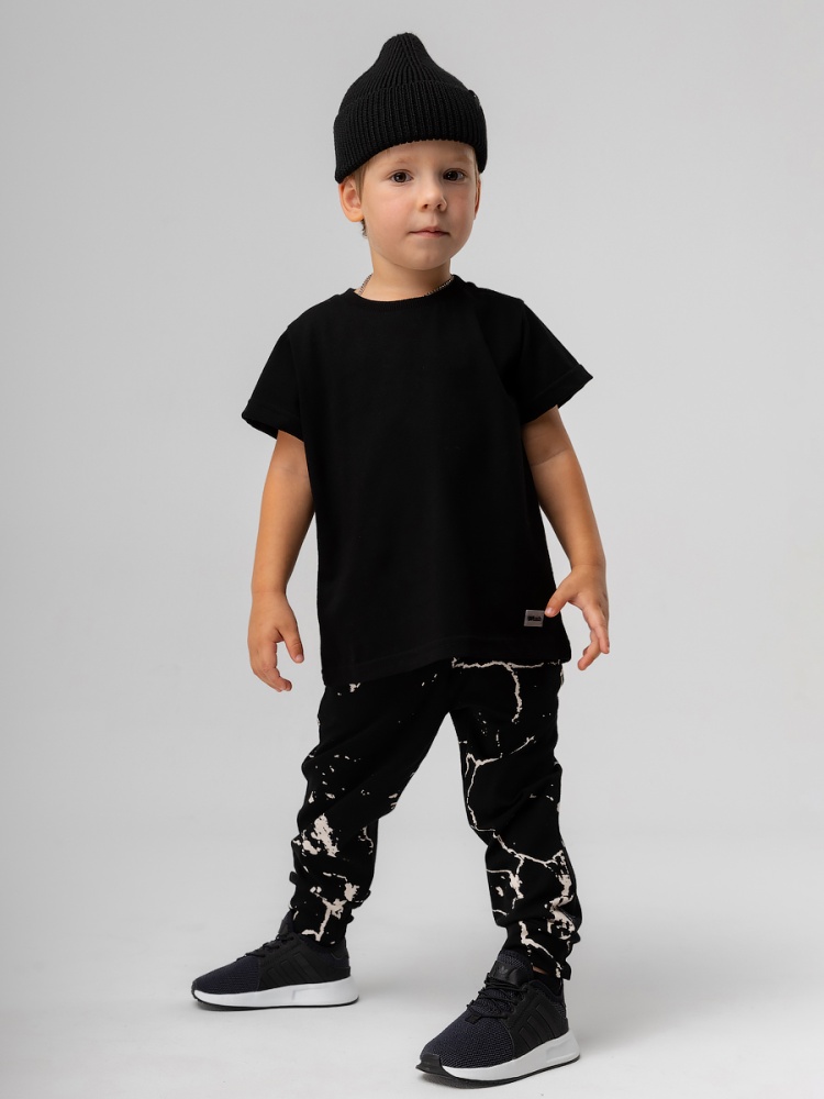 Материал кулирная гладь Состав 92% хлопок 8% лайкра Брюки- джоггеры детские. Детали: полуприлегающий покрой, пояс - эластичная резинка, низ изделия- манжеты.