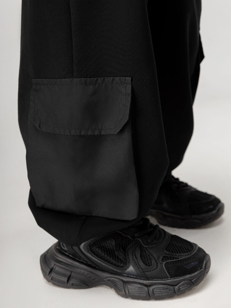 Материал футер двухнитка Состав 92% хлопок 8% лайкра Прямые, свободные брюки, по низу с дополнительной резинкой с фиксатором для затяжки. По бокам объемные накладные карманы с клапанами.