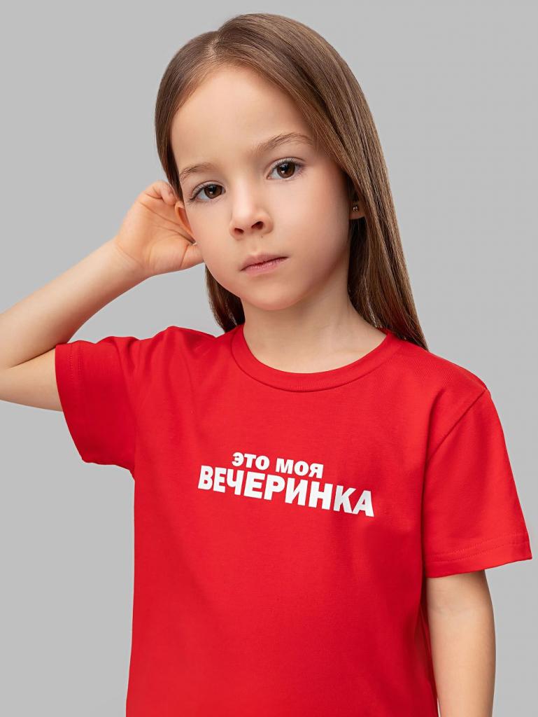 Артикул 4-220MU Состав 92% хлопок 8% лайкра Материал кулирная гладь Футболка с коротким рукавом, полуприлегающего покроя, округлый вырез горловины. На полочке принт "Это моя вечеринка"