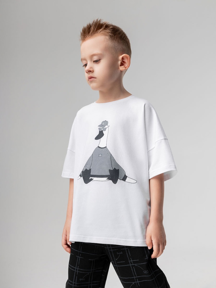 Материал кулирная гладь Состав 92% хлопок 8% лайкра Футболка для детей дошкольного возраста. Футболка свободного силуэта с втачным коротким рукавом. Горловина футболки округлой формы. Низ изделия прямой. На передней полочке нанесена печать.