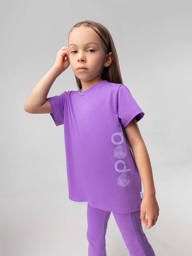 Материал кулирная гладь Состав 92% хлопок 8% лайкра Свободная футболка с коротким рукавом. Горловина футболки округлой формы. Печать на полочке bodo сердечки.