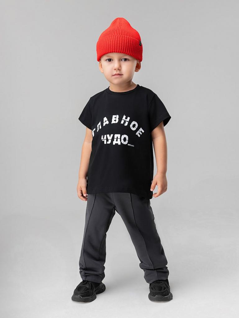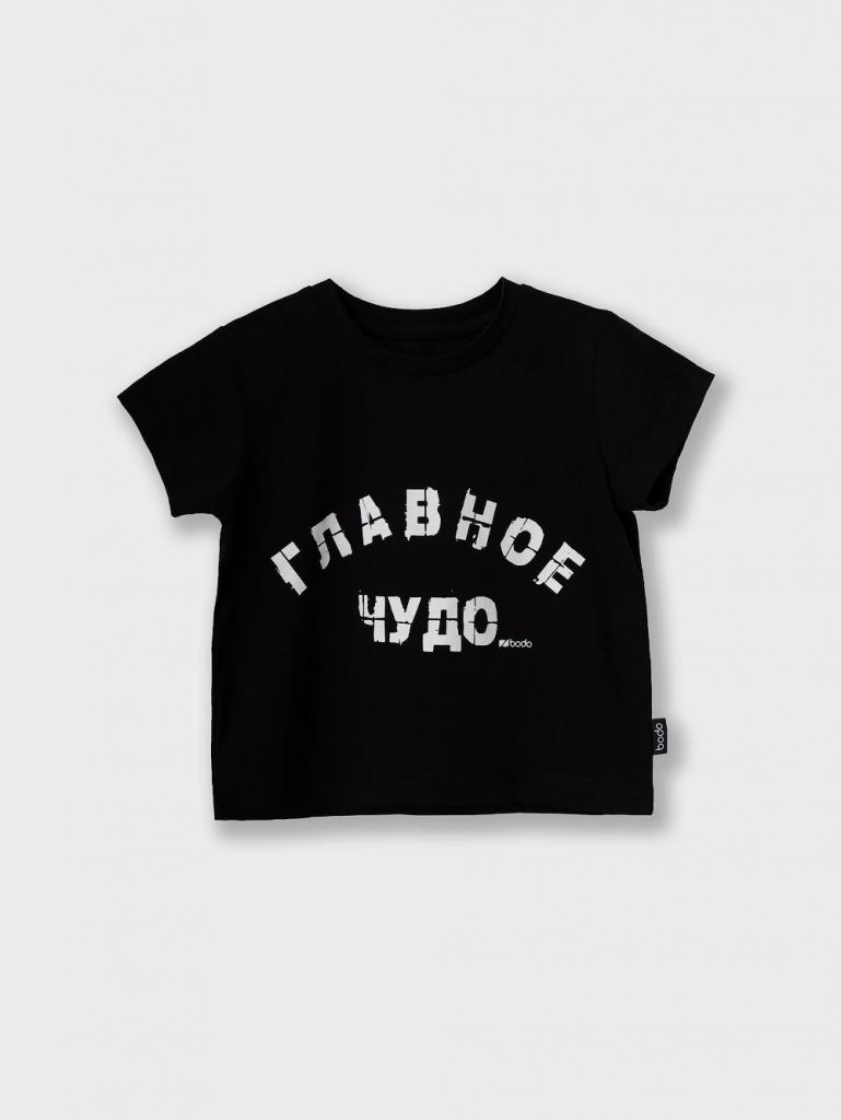 Артикул 54-33MU Материал кулирная гладь Состав 92% хлопок 8% лайкра Футболка прямого силуэта, с короткими рукавами. Горловина округлой формы. Низ изделия прямой. Принт на полочке "Главное чудо"