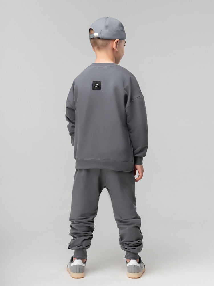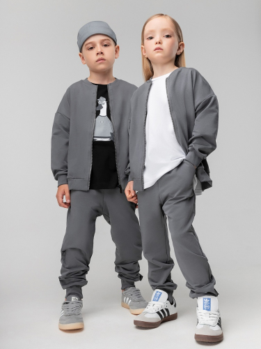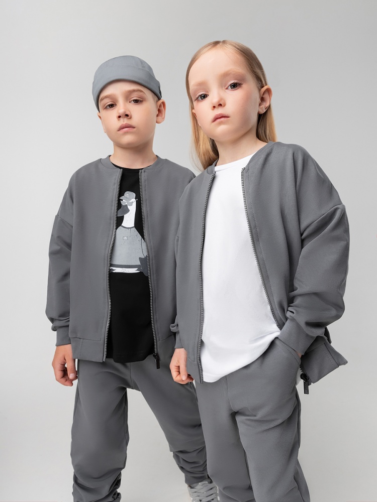 Материал футер двухнитка Состав 92% хлопок 8% лайкра Костюм для детей дошкольного возраста. Бомбер прямого силуэта свободный с центральной бортовой застёжкой на молнию, со спущенным плечом с втачным длинным рукавом с притачной манжетой. Бомбер с поясом по низу изделия. Горловина округлой формы. Брюки прямые свободные на притачном поясе с внутренней резинкой, на притачной манжете по низу изделия.