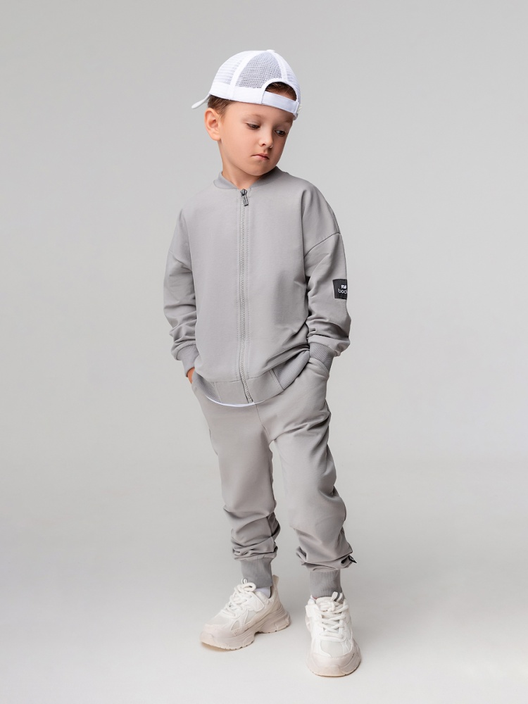 Материал футер двухнитка Состав 92% хлопок 8% лайкра Костюм для детей дошкольного возраста. Бомбер прямого силуэта свободный с центральной бортовой застёжкой на молнию, со спущенным плечом с втачным длинным рукавом с притачной манжетой. Бомбер с поясом по низу изделия. Горловина округлой формы. Брюки прямые свободные на притачном поясе с внутренней резинкой, на притачной манжете по низу изделия.