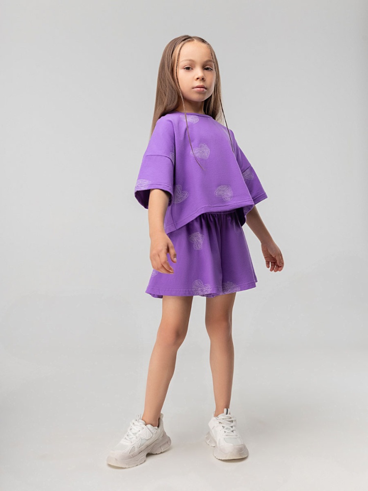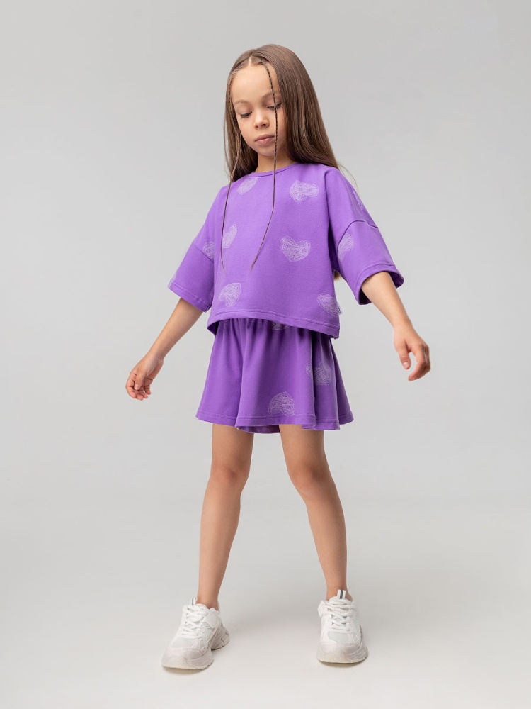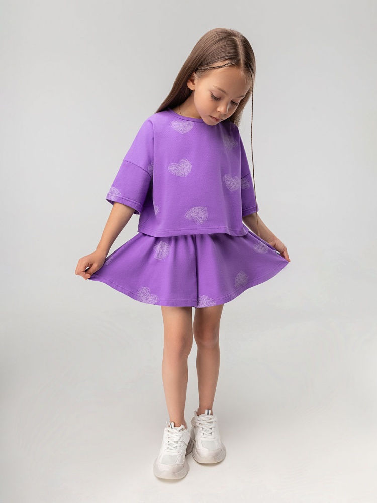 Материал кулирная гладь Состав 92% хлопок 8% лайкра Костюм для детей дошкольного возраста. Футболка укороченная свободного силуэта со спущенным плечом с втачным коротким рукавом. Горловина футболки округлой формы, обработана рибаной.Шорты-юбка для детей дошкольного возраста. Шорты свободные на притачном поясе с внутренней резинкой, с боковыми карманами.