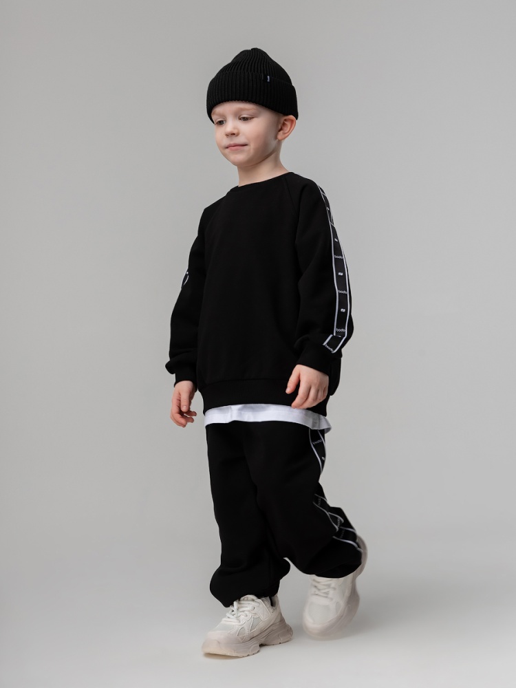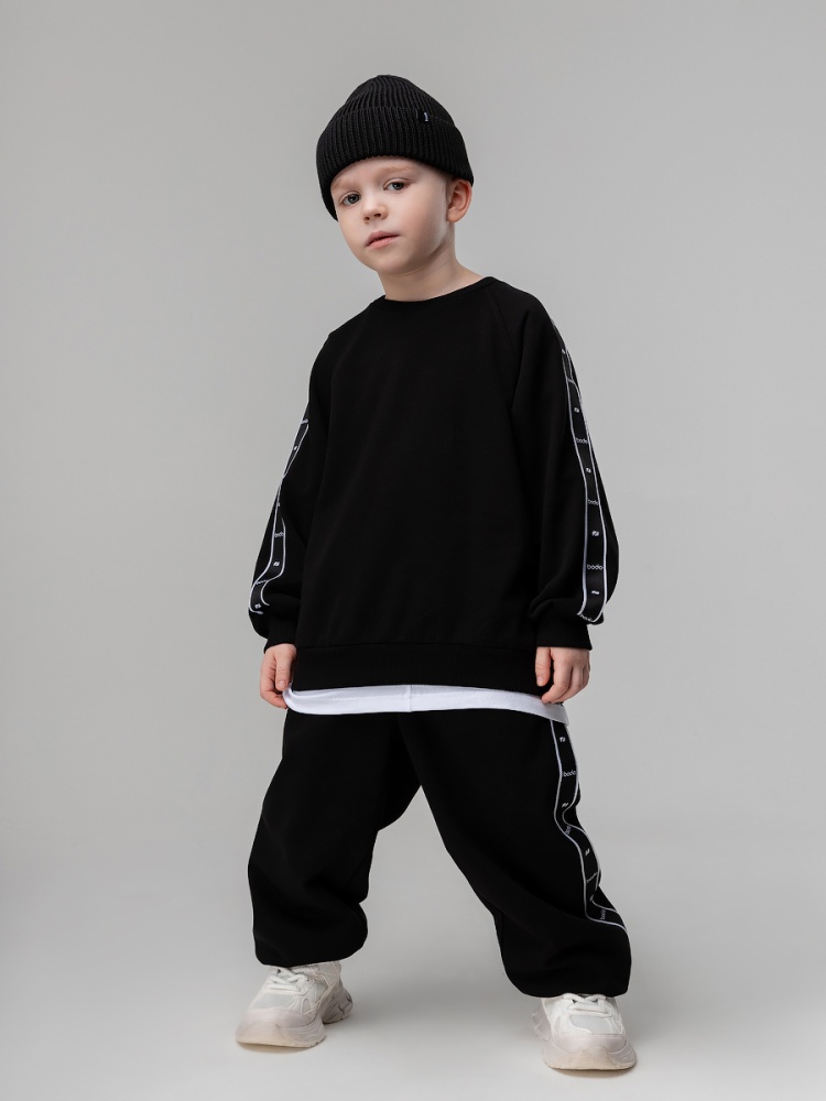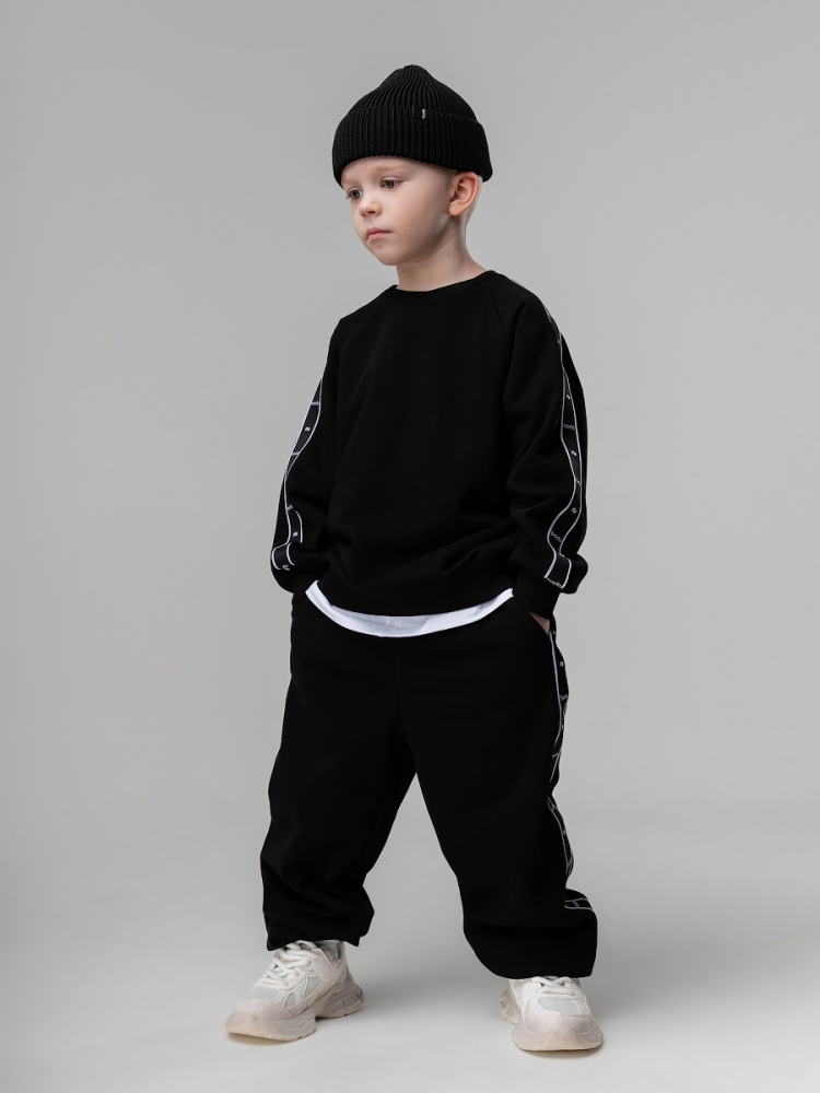 Материал футер трехнитка петля Состав 80% хлопок 20% полиэстер Костюм для детей дошкольного возраста. Толстовка прямого силуэта, свободная с рукавом реглан и притачной манжетой. Толстовка с поясом по низу изделия. По плечу и рукаву оформлена декоративной лентой с логотипом. Брюки прямые свободные на притачном поясе с внутренней резинкой. Низ брюк с цельнокроеной манжетой на резинке. Брюки с боковыми карманами.
