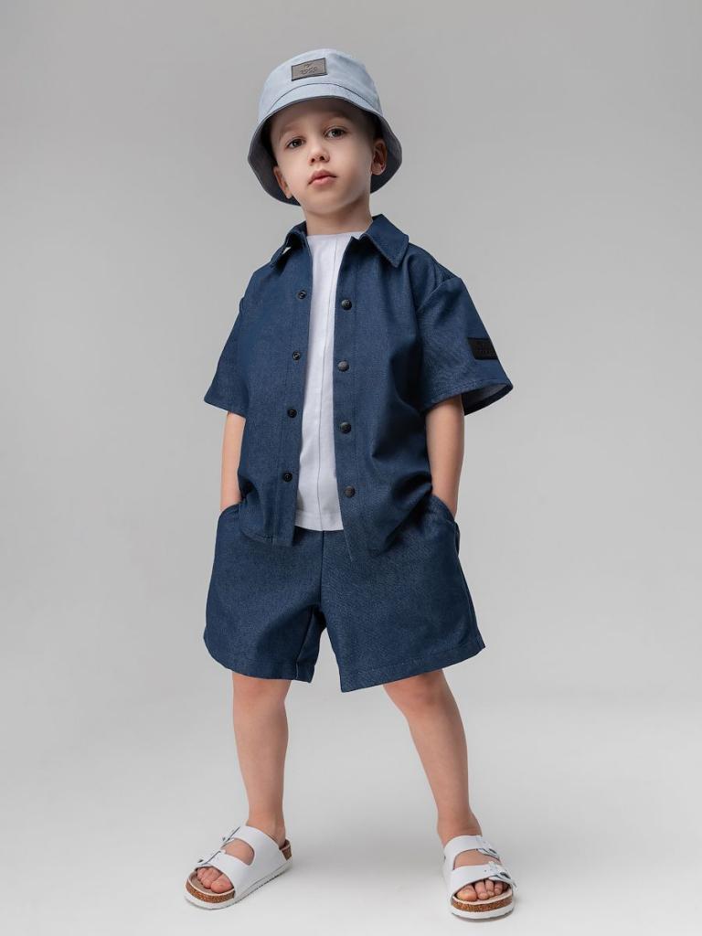 Артикул 11-591MU Состав 80% хлопок 20% полиэстер Материал джинсовая ткань Костюм: рубашка и шорты. Прямая рубашка без подкладки на кнопках, отложной воротничок, короткий рукав. Низ изделия прямой. Шорты прямые свободные на поясе с внутренней резинкой. Шорты с боковыми карманами.