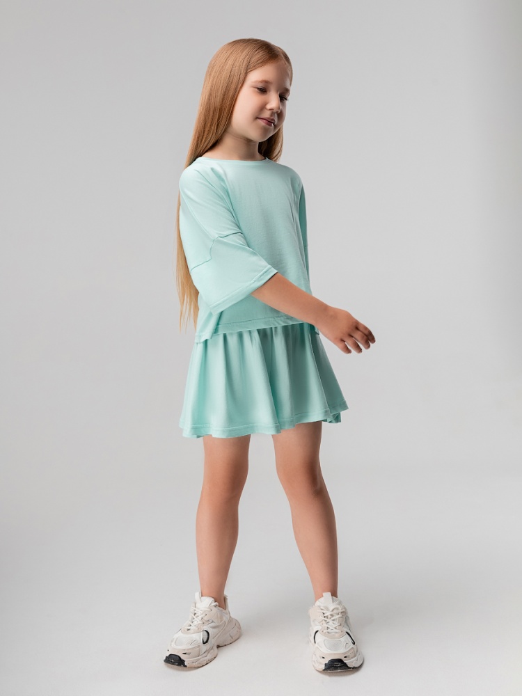 Материал кулирная гладь Состав 92% хлопок 8% лайкра Костюм для детей дошкольного возраста. Футболка укороченная свободного силуэта со спущенным плечом с втачным коротким рукавом. Горловина футболки округлой формы, обработана рибаной. Шорты-юбка для детей дошкольного возраста. Шорты свободные на притачном поясе с внутренней резинкой, с боковыми карманами.