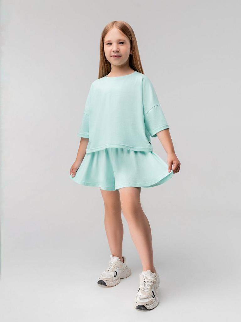 Артикул 11-595MU Состав 92% хлопок 8% лайкра Материал кулирная гладь Костюм для детей дошкольного возраста. Футболка укороченная свободного силуэта со спущенным плечом с втачным коротким рукавом. Горловина футболки округлой формы, обработана рибаной. Шорты-юбка для детей дошкольного возраста. Шорты свободные на притачном поясе с внутренней резинкой, с боковыми карманами.