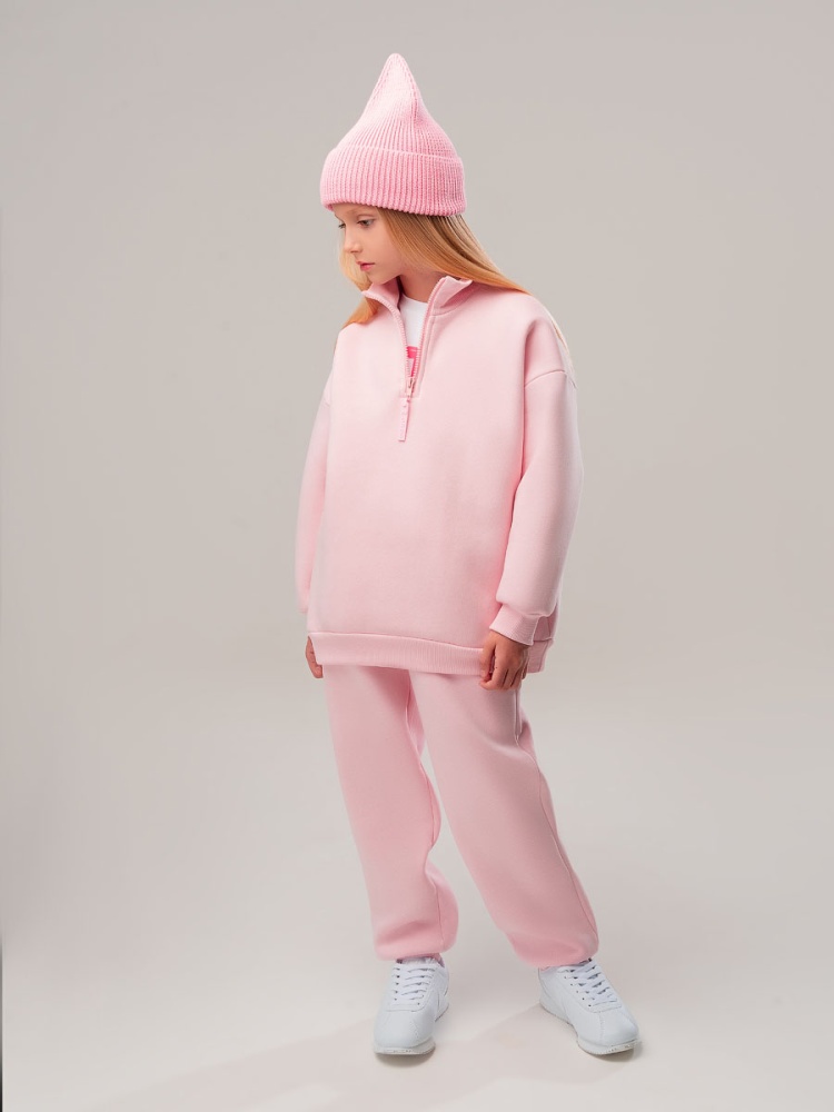 Материал футер трехнитка с начесом Состав 80% хлопок 20% полиэстер Костюм для детей дошкольного возраста. Толстовка свободного силуэта, со спущенным плечом и втачными рукавами с притачной манжетой. Воротник стойка, застёжка на короткую молнию по центру полочки.Брюки прямые свободные на притачном поясе с внутренней резинкой, на притачной манжете по низу изделия. С боковыми карманами.
