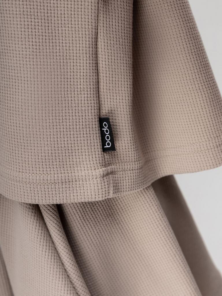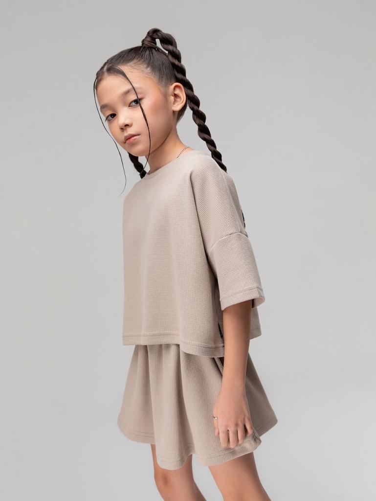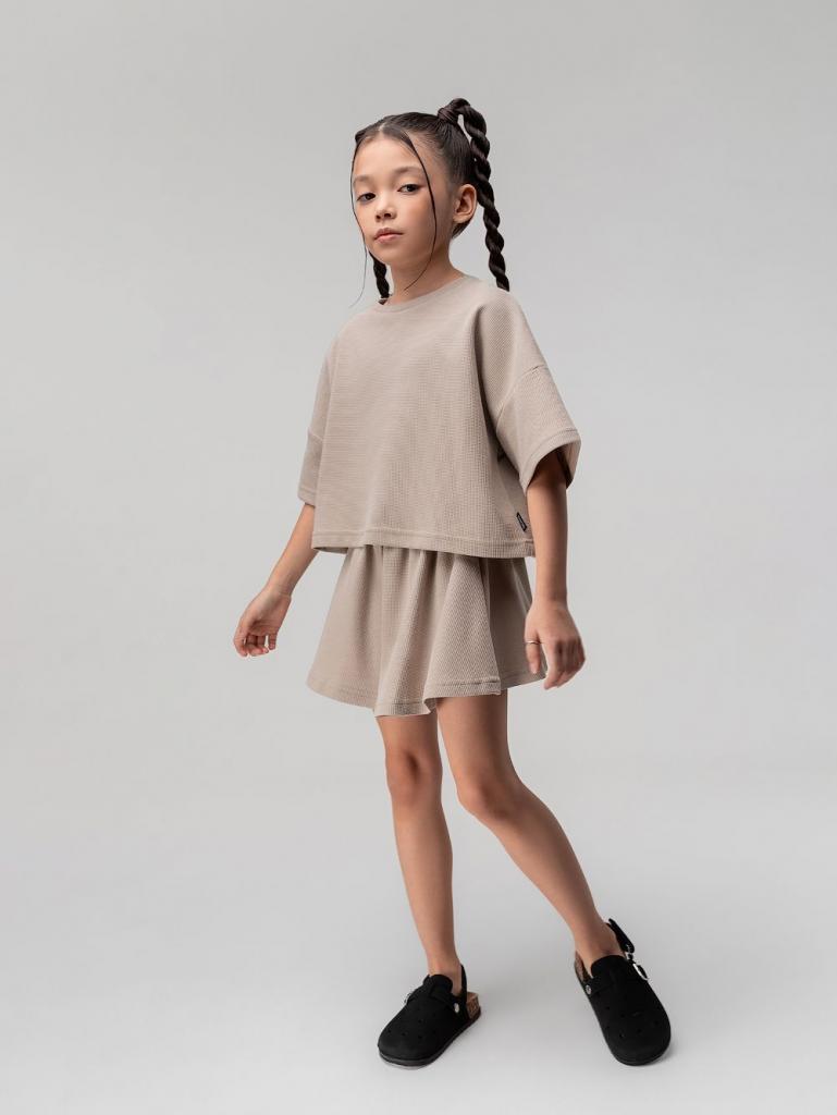 Артикул 11-621MU Состав 92% хлопок 8% лайкра Материал кулирная гладь Костюм для девочки из вафельной кулирки: футболка и шорты-юбка. Укороченная футболка свободного силуэта со спущенным плечом с коротким рукавом. Свободные шорты-юбка, пояс на резинке.