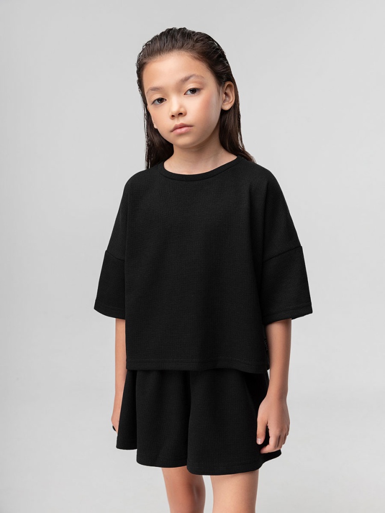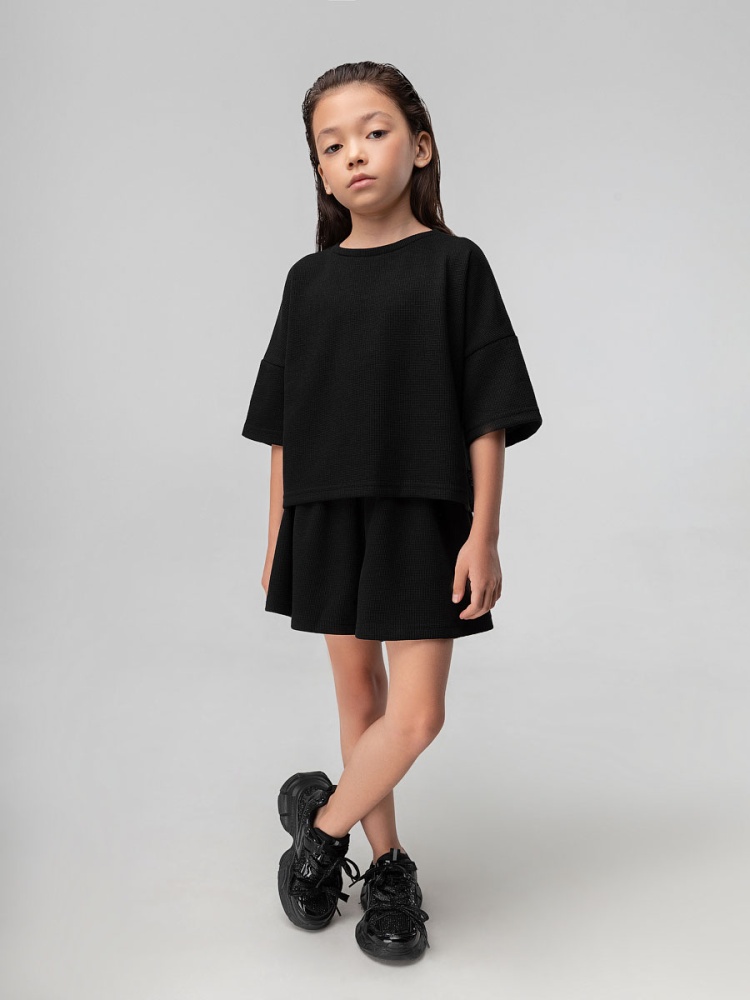 Материал кулирная гладь Состав 92% хлопок 8% лайкра Костюм для девочки из вафельной кулирки: футболка и шорты-юбка. Укороченная футболка свободного силуэта со спущенным плечом с коротким рукавом. Свободные шорты-юбка, пояс на резинке, с боковыми карманами.