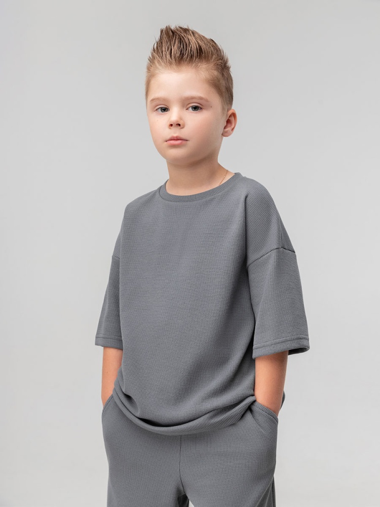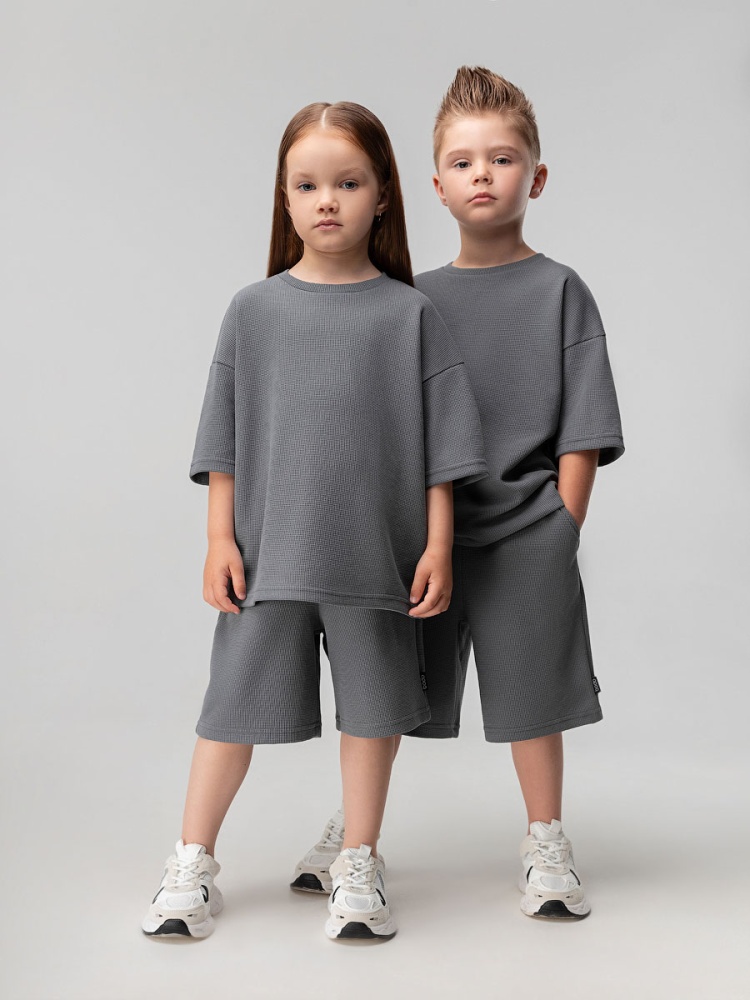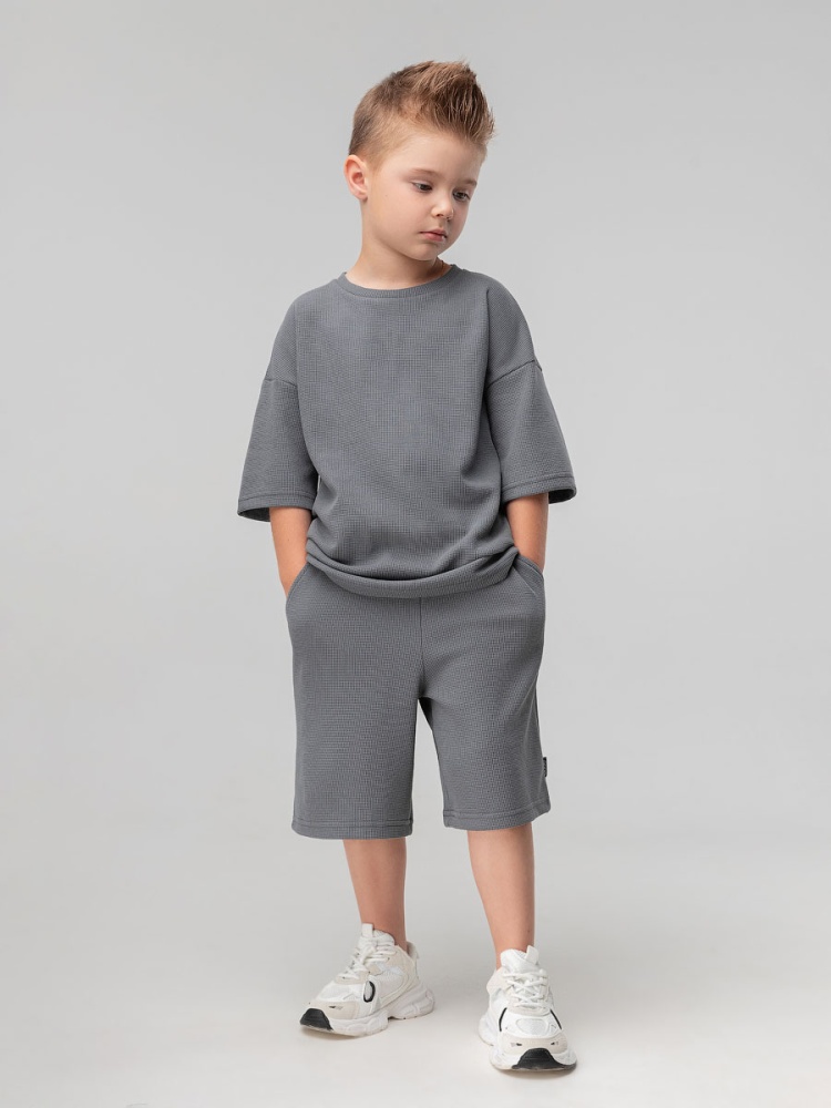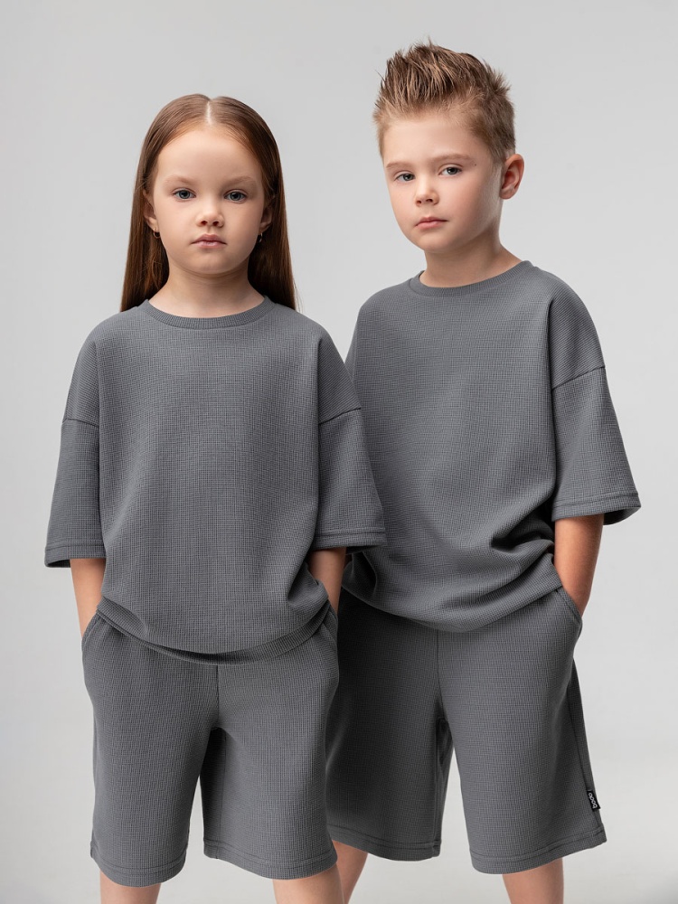 Материал кулирная гладь Состав 92% хлопок 8% лайкра Костюм из вафельной кулирки: футболка и шорты. Футболка свободного силуэта с коротким рукавом. Шорты прямые, свободные с боковыми карманами.