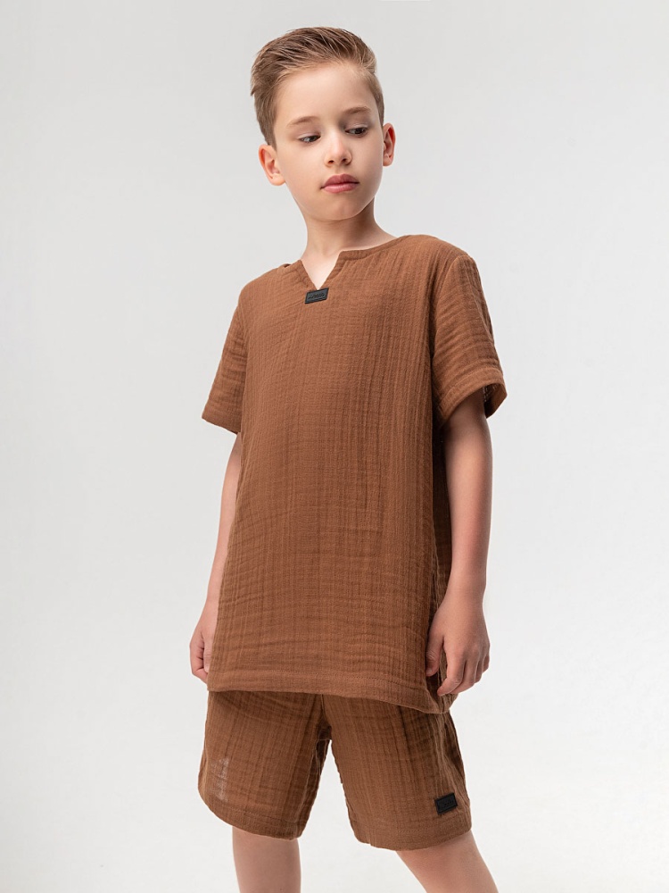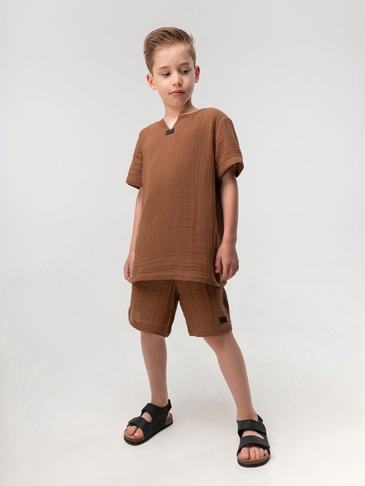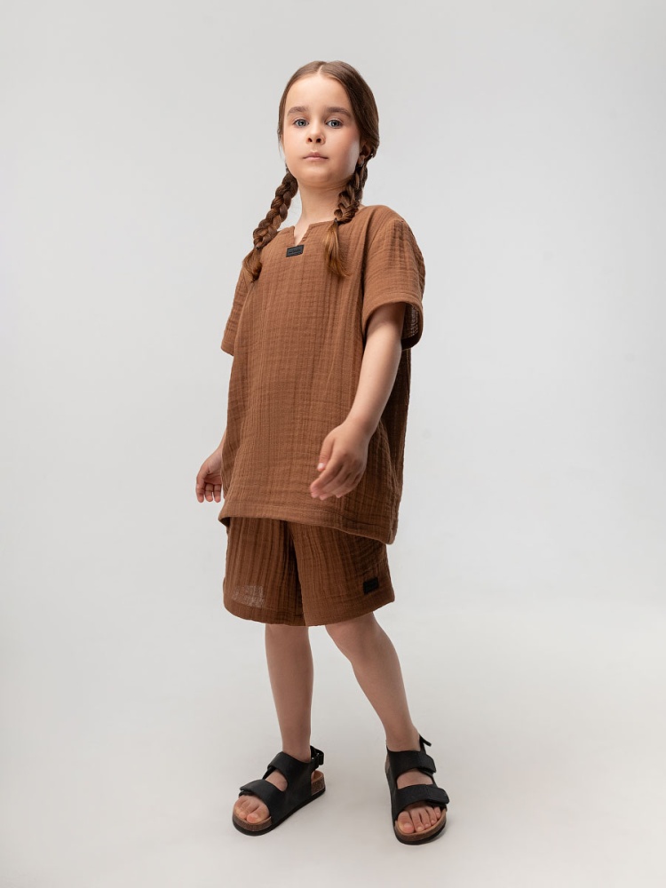 Материал муслин Состав 100% хлопок Легкий муслиновый костюм: футболка и шорты. Прямая футболка с коротким рукавом, ворот с разрезом и свободные шорты с поясом на резинке.