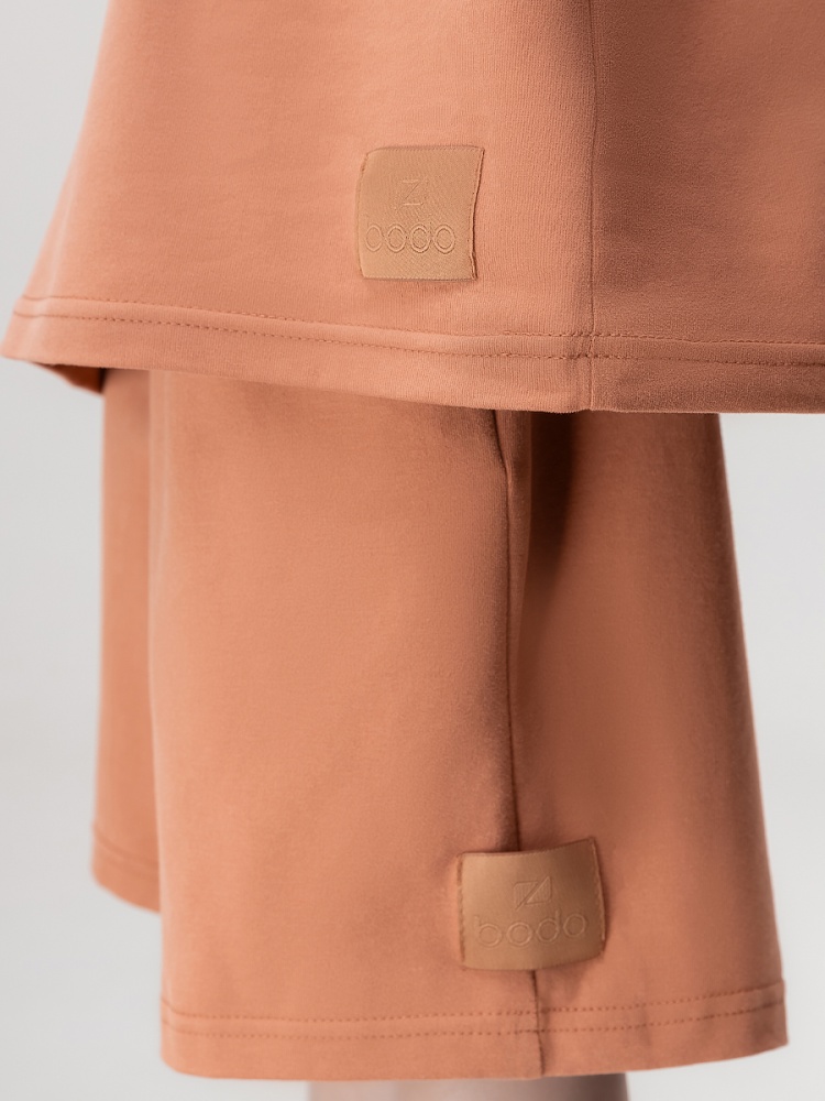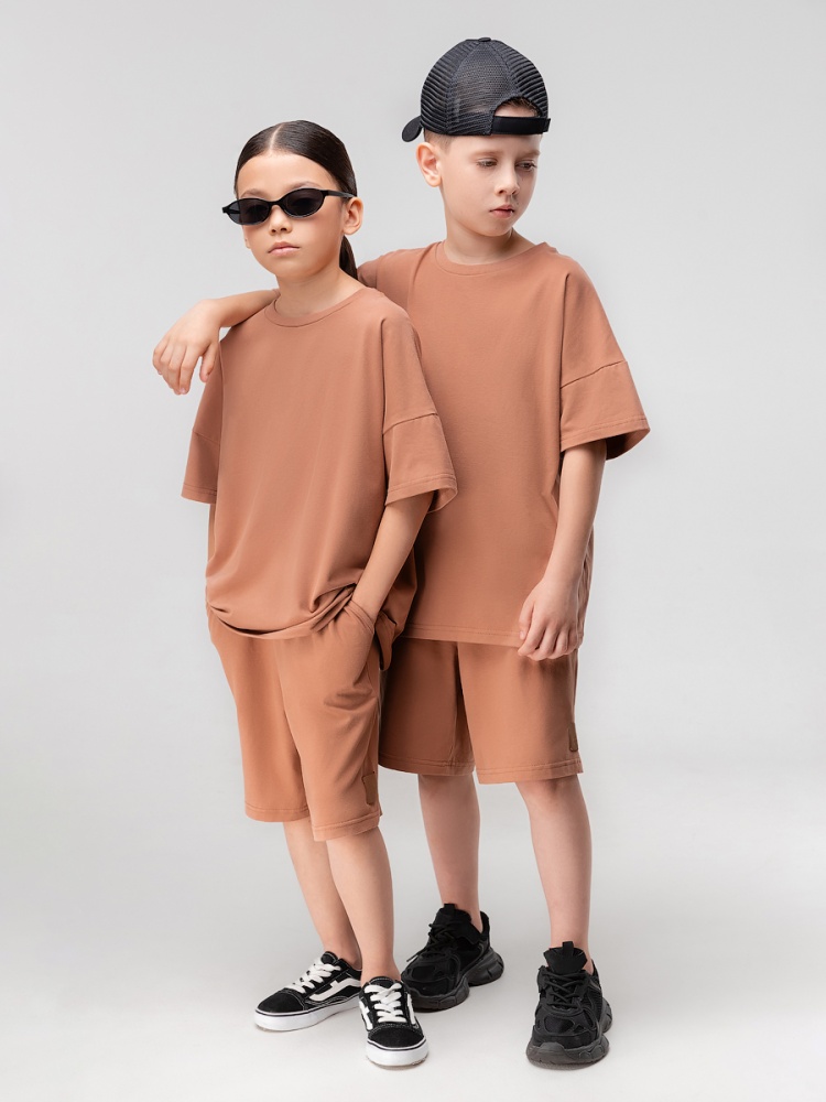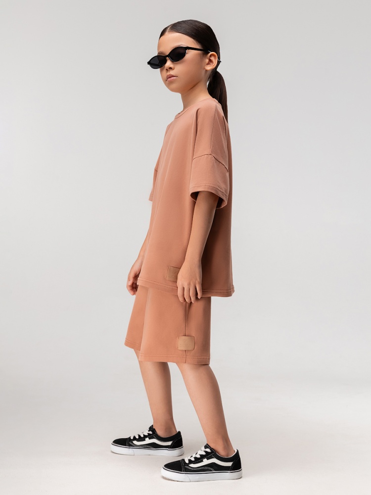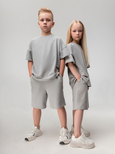 Материал кулирная гладь Состав 92% хлопок 8% лайкра Костюм с эффектом фрчи: футболка и шорты. Свободная футболка с коротким рукавом и прямые шорты с боковыми карманами, пояс на резинке.
